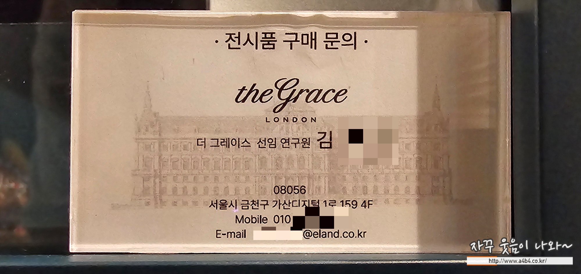 이번 전시회는 주최는 더그레이스런던, 더현대, 주관은 이랜드뮤지엄이다. 전시품은 이랜드 뮤지엄 소장품으로 구성되어있고, 전시된 전시품은 돈만 맞다면 구매가 가능한 것 같다. 해당 공간에 전시된 전시품 아래에는 이렇게 담당자의 이름, 전화번호, 이메일 주소가 노출되어 있다.