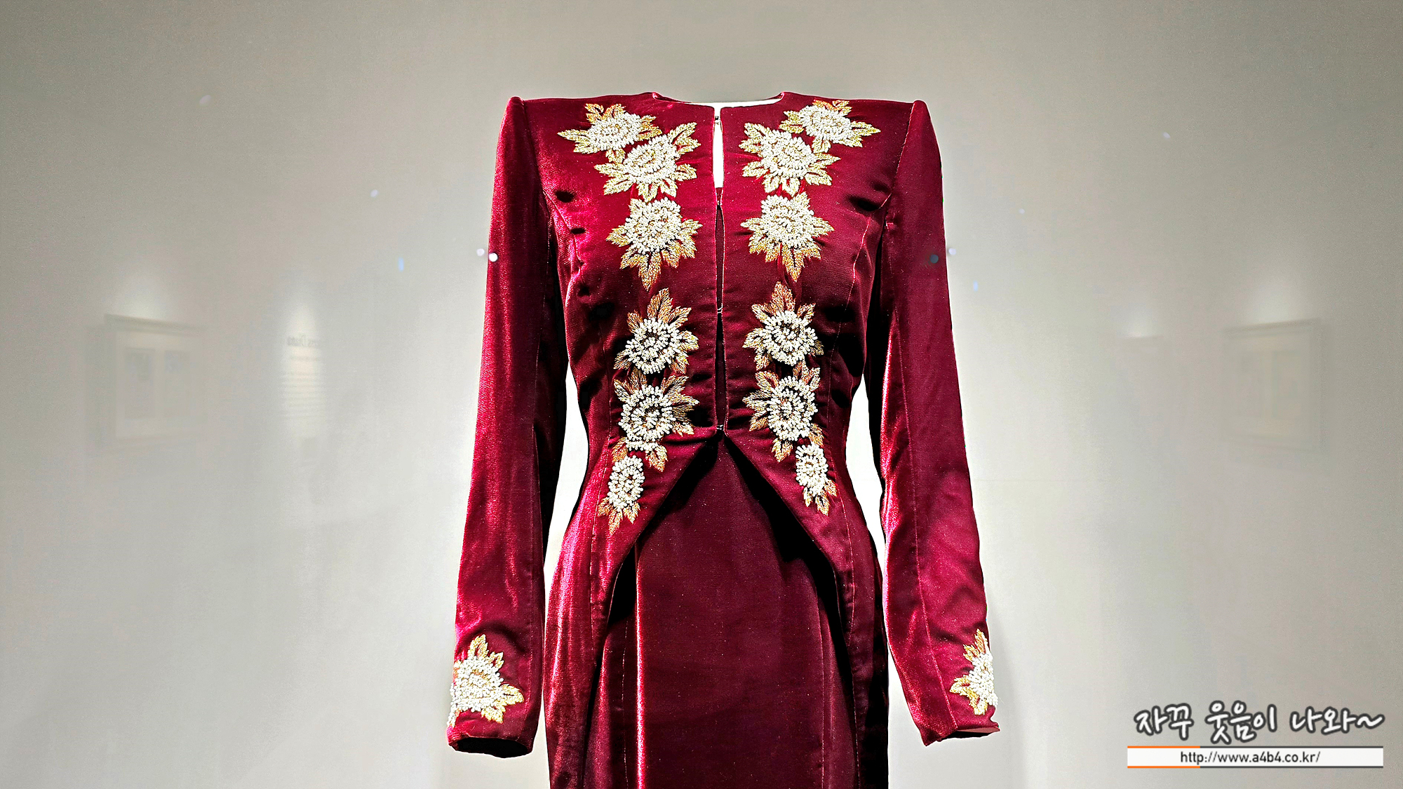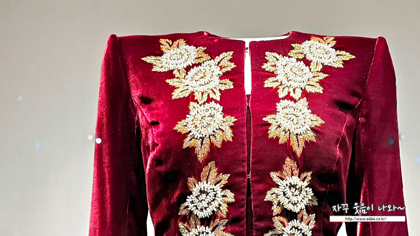 다이애나 비가 내한했을 당시청와대 공식 일정에 입은 자수 장 식 벨벳 드레스. 다이애나 비가 가장 아낀 디자이너 캐서린 워커 가 디자인했다. 러시아 왕실 예복에서 영감을 받은 이 드레스는 어 느 각도에서도 아름다워 보일 수 있도록 세심하게 제작되었다