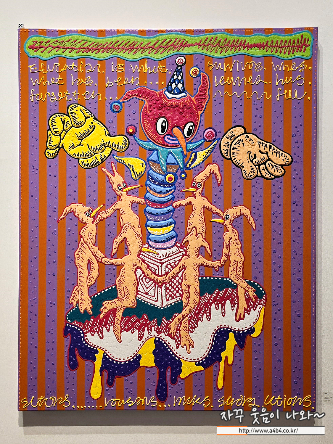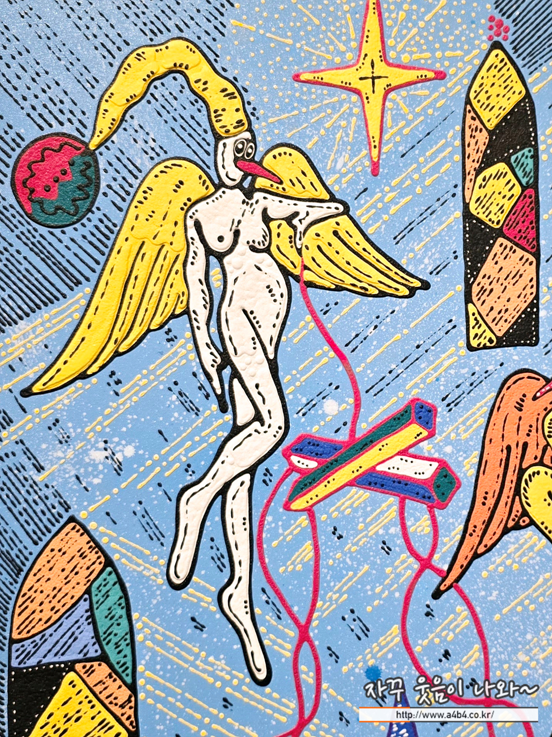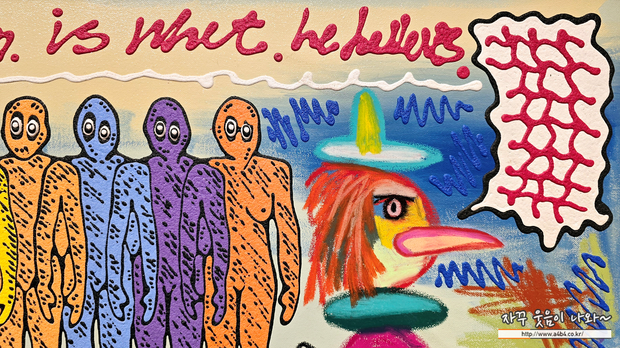 작품의 캐릭터나 컬러가 상당히 독특합니다. 어떻게 보면아직은 미완의 습작같은 느낌을 주는 더 풀 작가의 작품들인데요. 아크릴 물감을 사용한 것 같기는 한데, 물감으로 라인을 따고 그 안에 다른 컬러의 물감을 넣어 작업한 것 같네요.