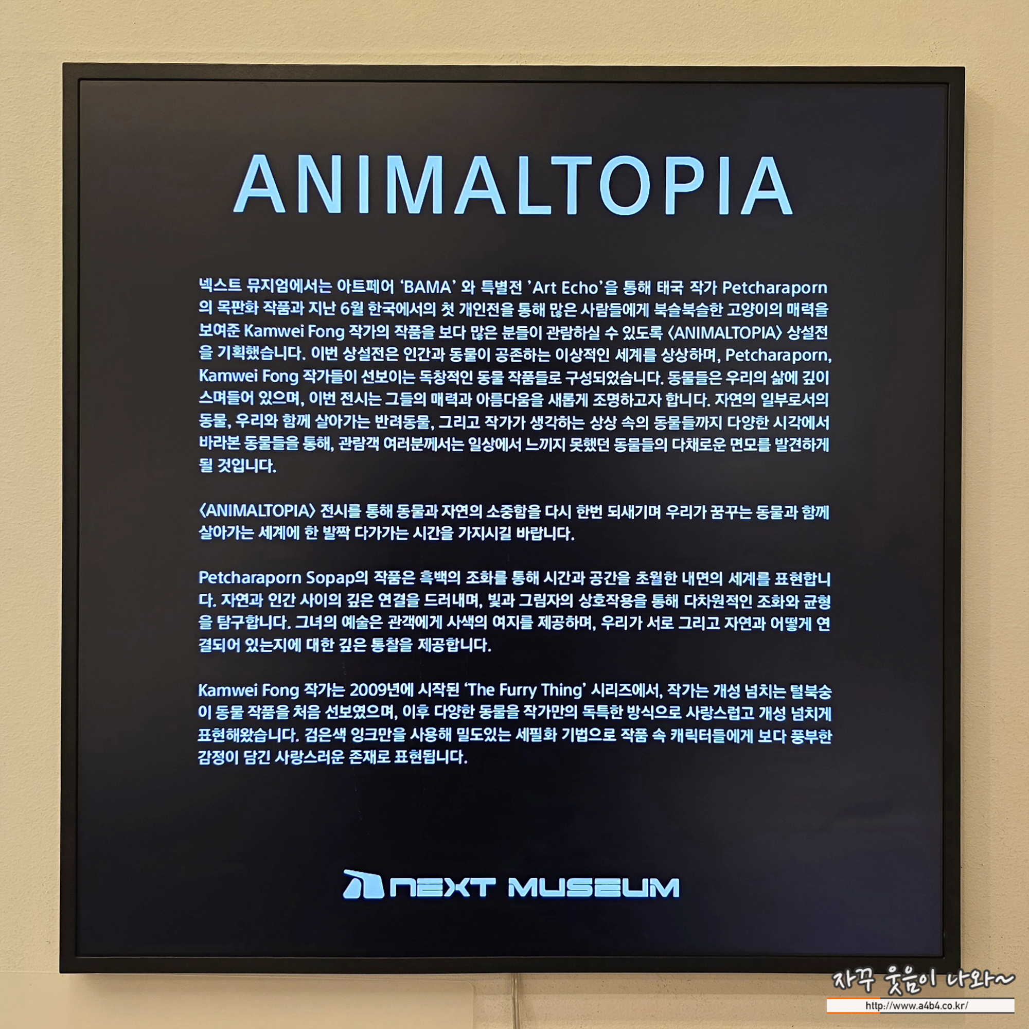 넥스트 뮤지엄에서는 아트페어 'BAMA' 와 특별전 'Art Echo'을 통해 태국 작가 Petcharaporn 의 목판화 작품과 지난 6월 한국에서의 첫 개인전을 통해 많은 사람들에게 북슬북슬한 고양이의 매력을 보여준 Kamwei Fong 작가의 작품을 보다 많은 분들이 관람하실 수 있도록 <ANIMALTOPIA> 상설전 을 기획했습니다. 이번 상설전은 인간과 동물이 공존하는 이상적인 세계를 상상하며, Petcharaporn, Kamwei Fong 작가들이 선보이는 독창적인 동물 작품들로 구성되었습니다. 동물들은 우리의 삶에 깊이 스며들어 있으며, 이번 전시는 그들의 매력과 아름다움을 새롭게 조명하고자 합니다. 자연의 일부로서의 동물, 우리와 함께 살아가는 반려동물, 그리고 작가가 생각하는 상상 속의 동물들까지 다양한 시각에서 바라본 동물들을 통해, 관람객 여러분께서는 일상에서 느끼지 못했던 동물들의 다채로운 면모를 발견하게 될 것입니다.