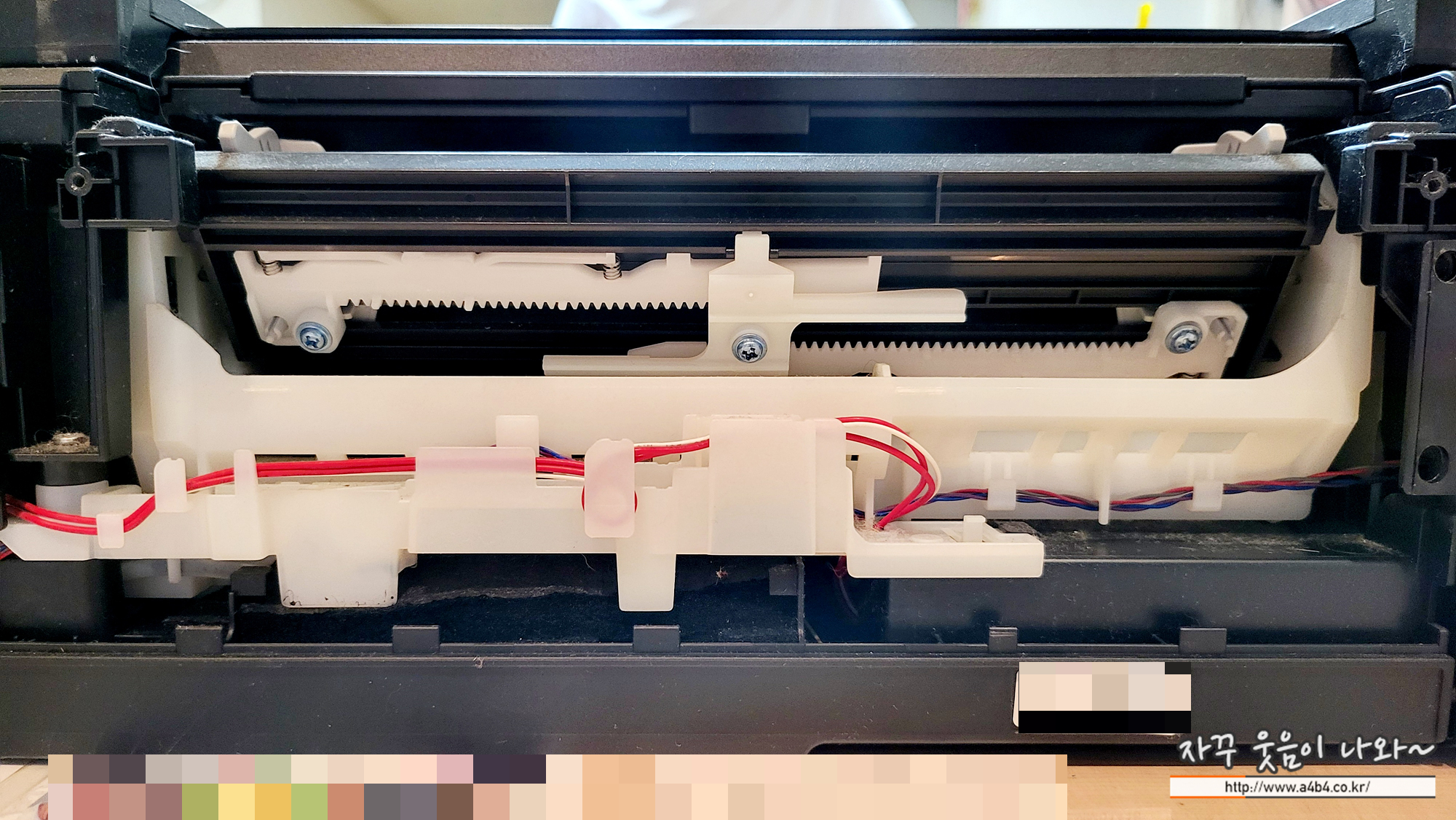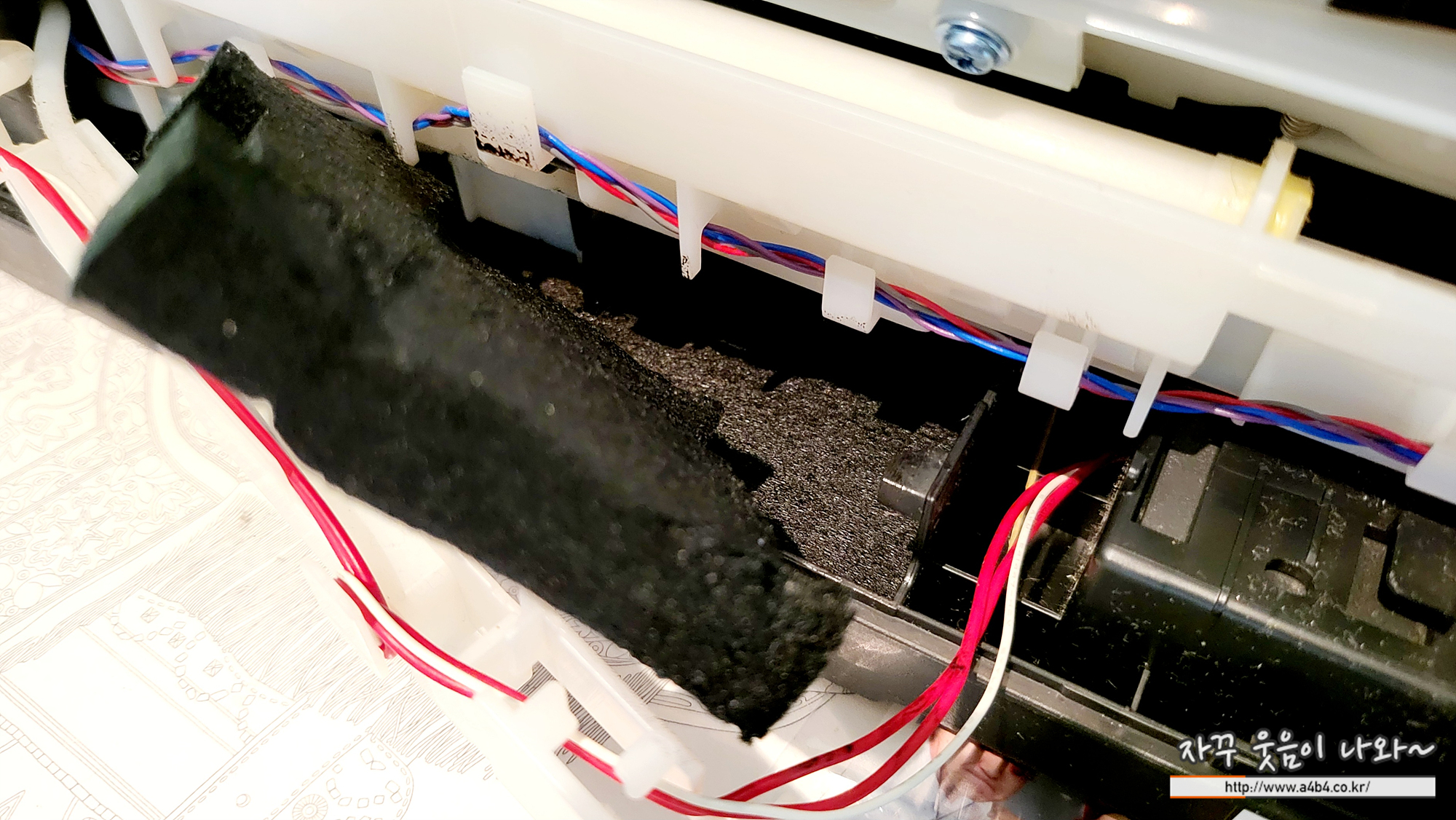이렇게 캐논 프린터 헤드청소를 하면서 사용되는 잉크가 프린터 뒷부분 앱소번트 패드로 잉크를 흘리게 됩니다.