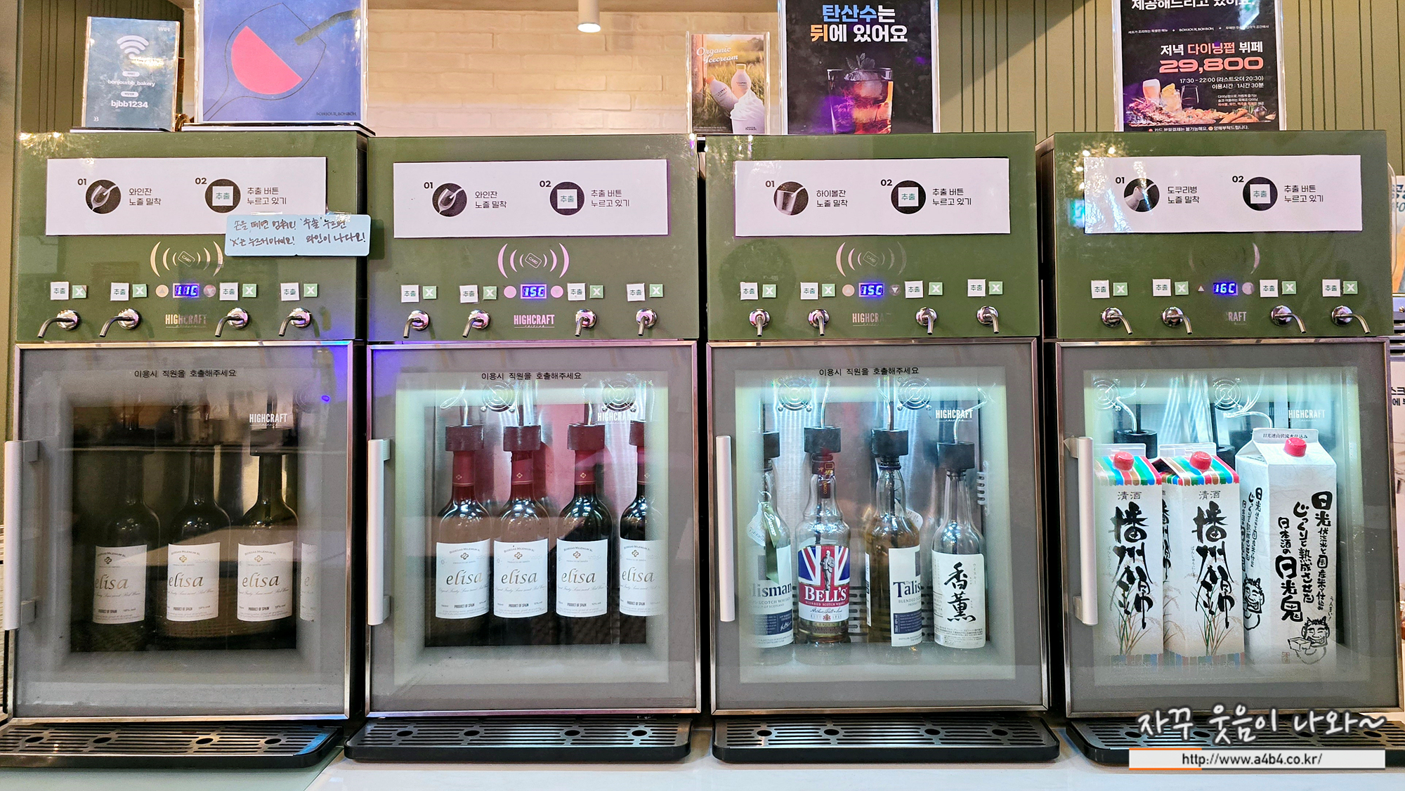 이렇게 벽쪽 중앙에 몇 가지 안주와 주류가 마련되어 있습니다. 물론 셀프...