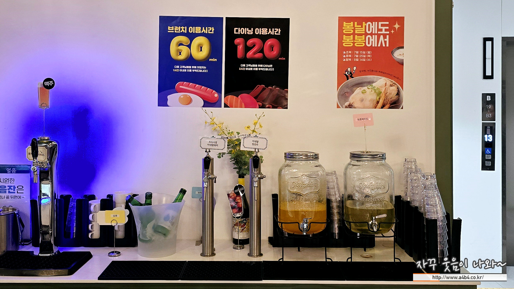 소주는 참이슬이 병으로 맥주는 셀프바가 준비되어 있고요.