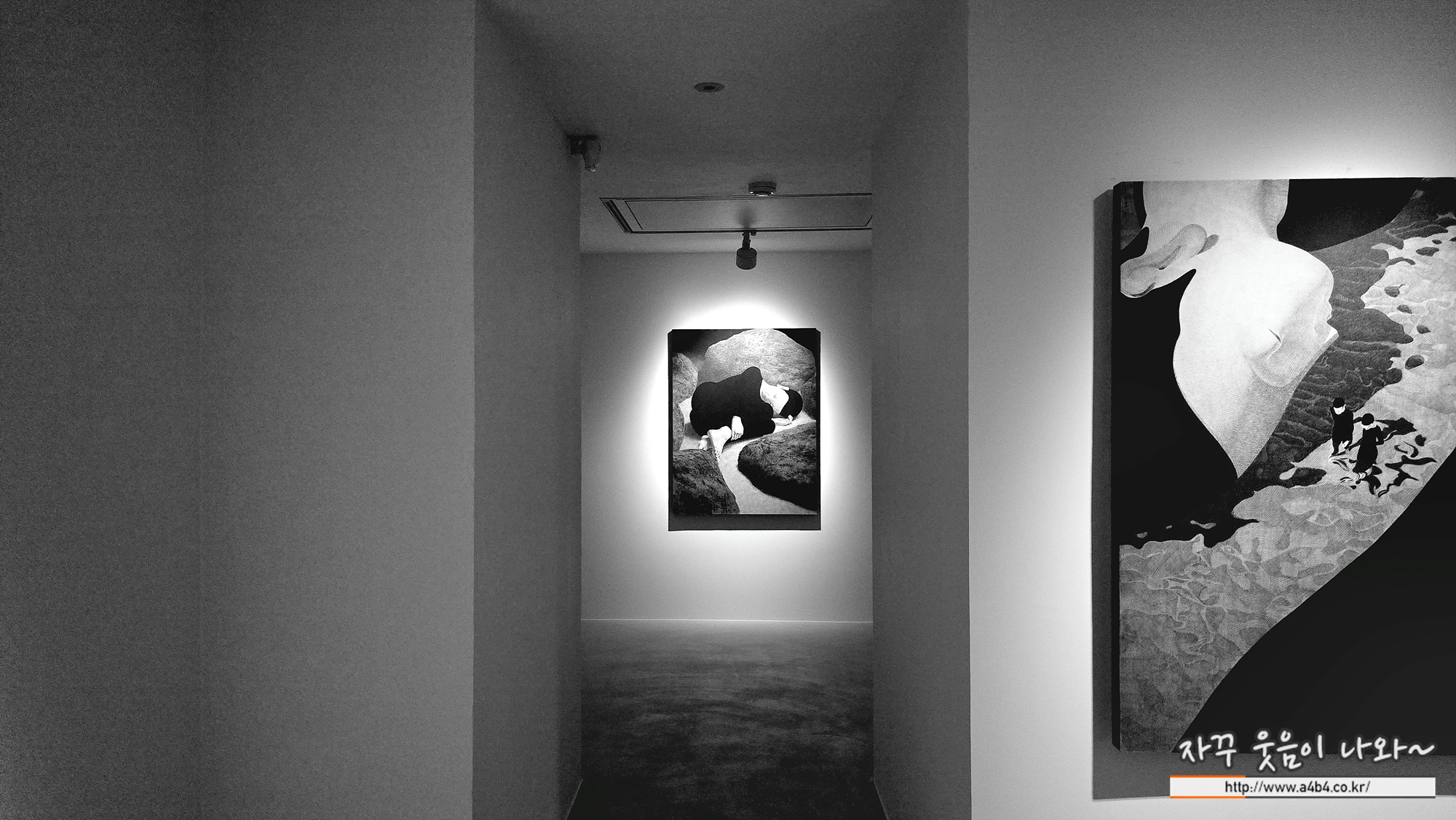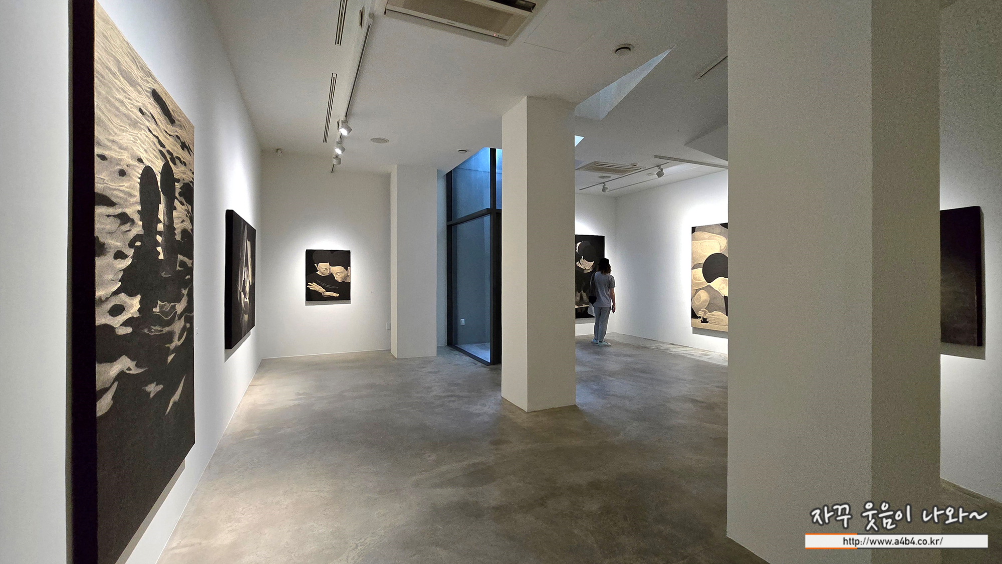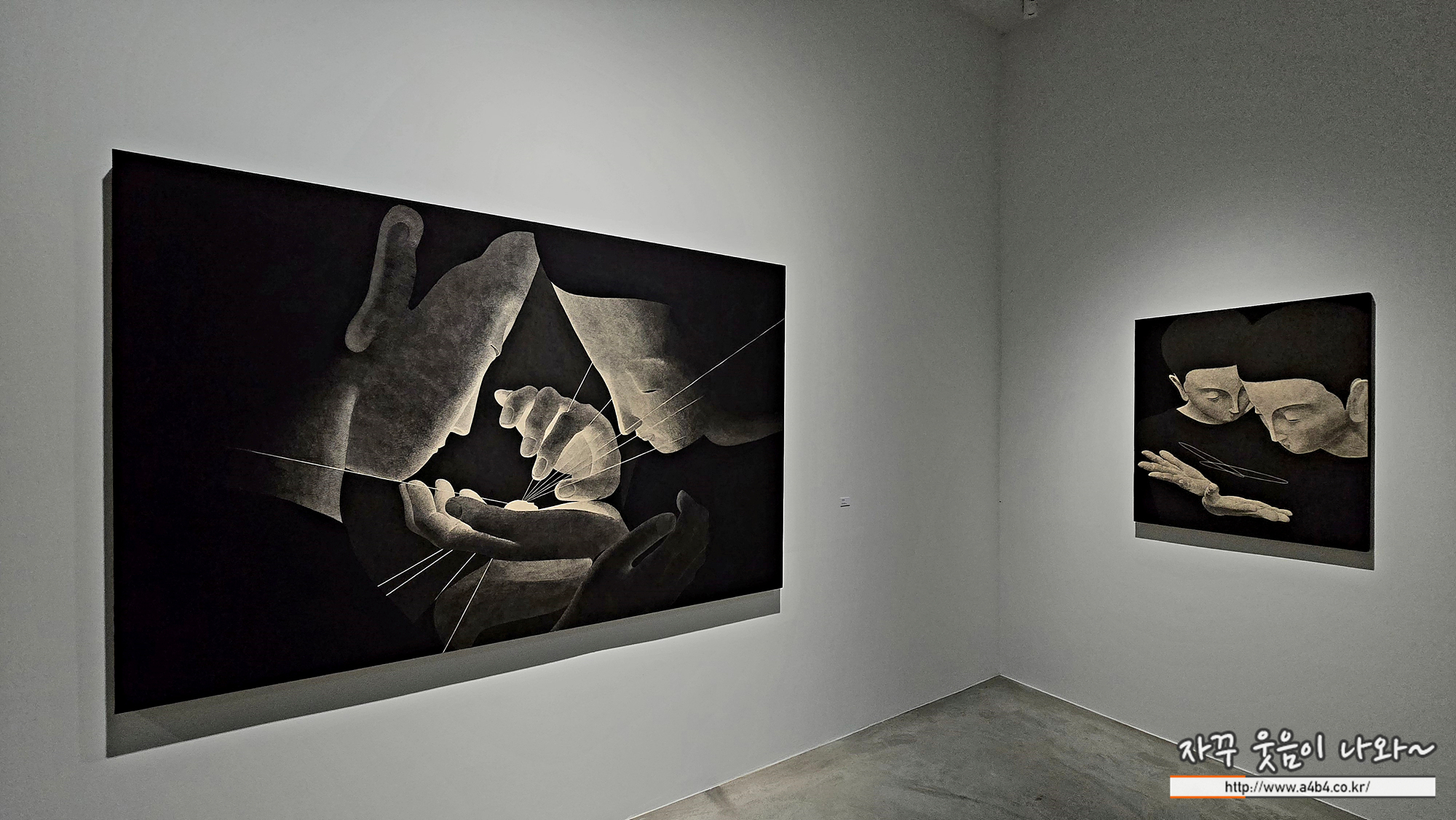 이번 에브리데이 몬데이 갤러리 무나씨 개인전에 전시된 작품들은 2미터 사이즈의 규모 있는 작품 중심으로 전시되어 있습니다. 하얀 벽에 흑백의 작품으로 전시되어 있어 상당히 강한 대비와 함께 감상에 집중할 수 있네요.