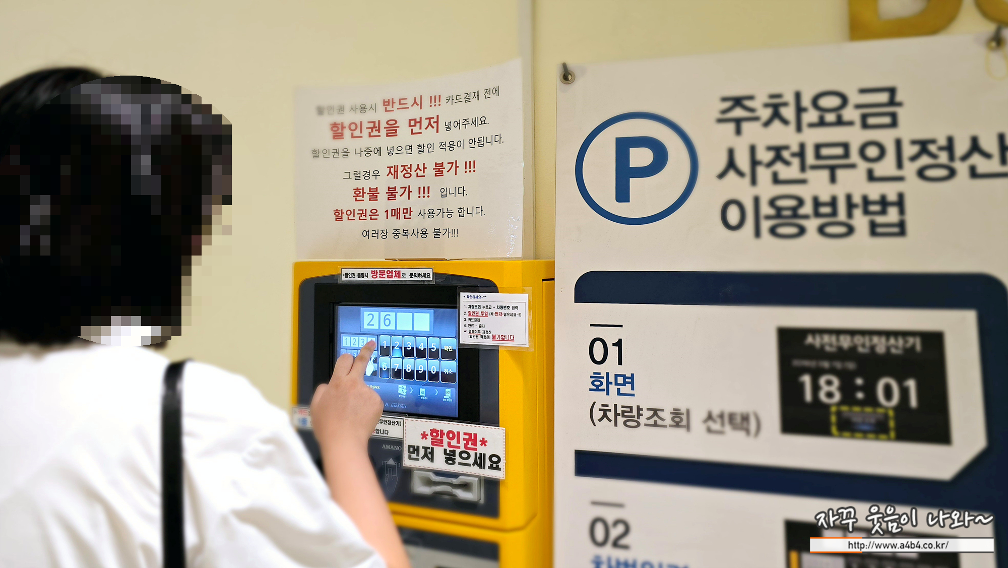 수령한 주차권은 지하 주차장에서 차량 번호를 입력하고, 주차할인권을 삽입하시면 됩니다. 한 대 차량에 한 장의 할인권만 적용이 가능하며, 초과된 금액은 신용카드 결제만 가능합니다.