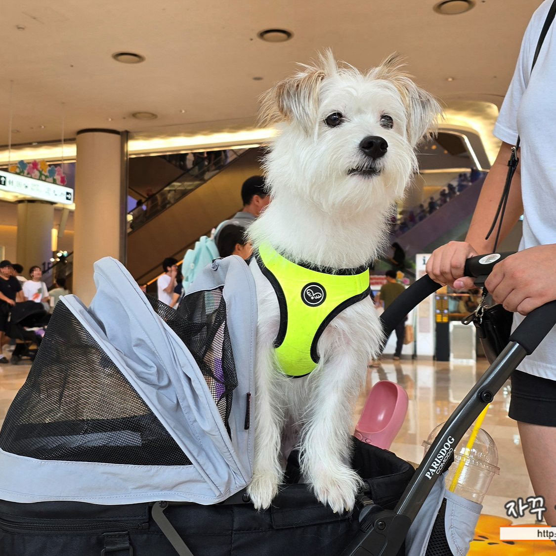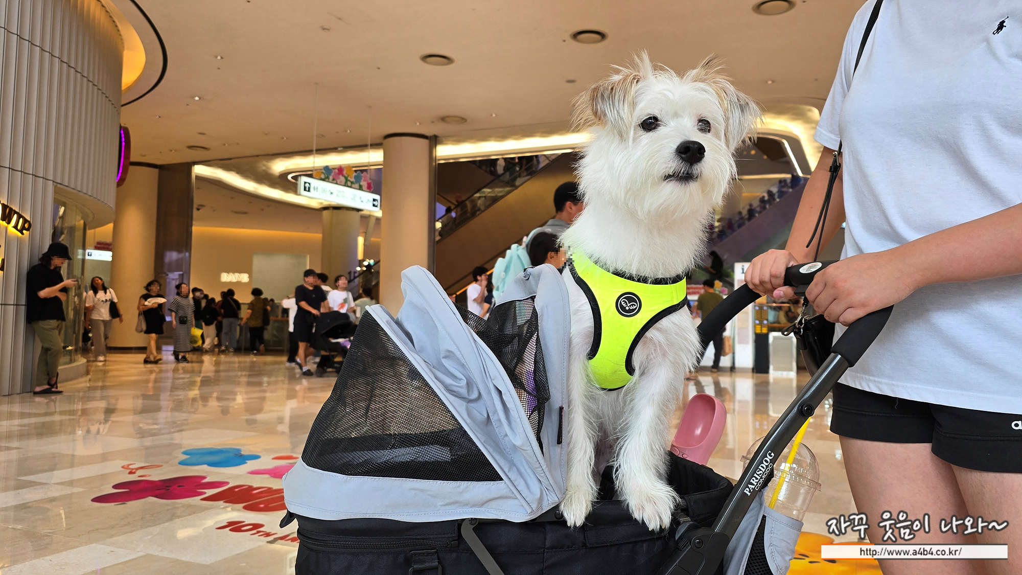 이렇게 설탕이를 개모차에 태우고 다니니 대부분의 쇼핑몰과 매장 입장에 제한 없었습니다.