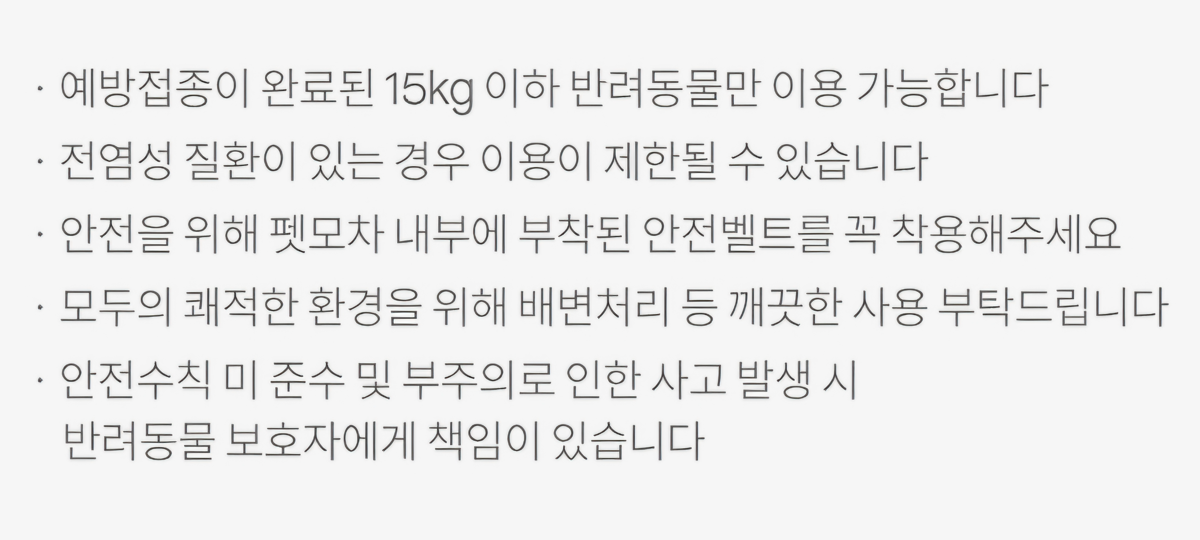 저희 강아지는 중소형견으로 출입에 어려움은 없었는데요. 15kg을 초과한 강아지는 입장이 불가능합니다. 나머지 제한 조건은 일반 상식적인 수준에서 고려하시면됩니다.