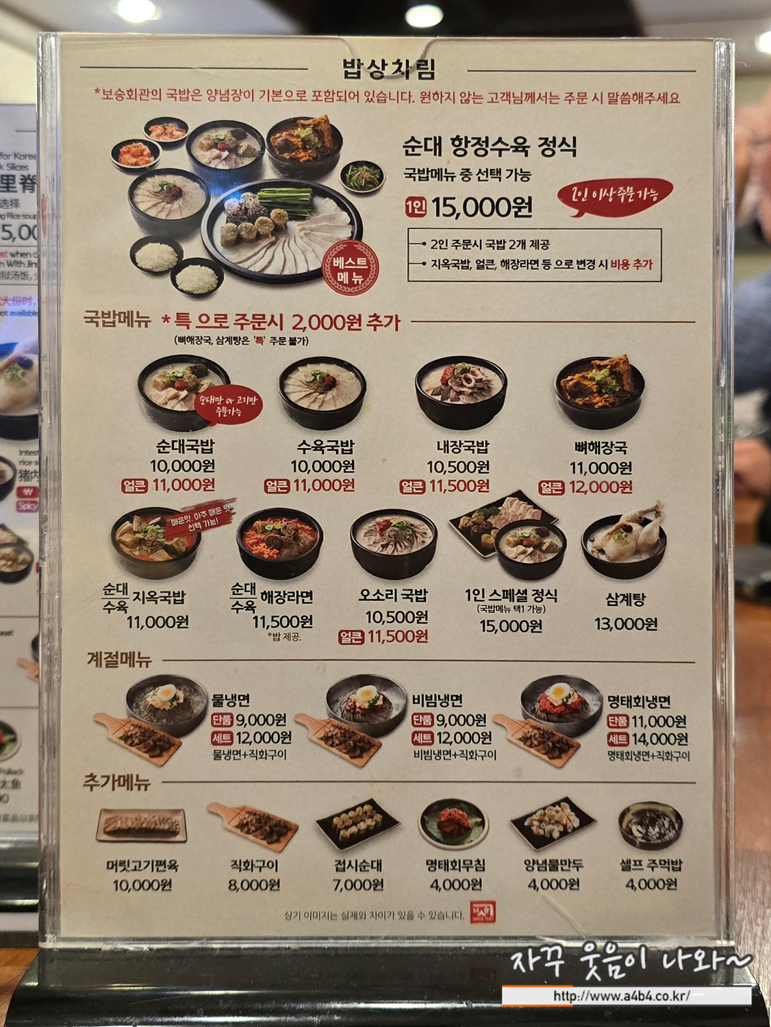 순대국밥, 수육국밥, 내장국밥, 오소리국밥 등의 국밥류와 뼈해장국, 삼계탕, 냉면류가 있습니다. 가격은 1만원 초반대이며 일반맛과 얼큰한 맛 선택이 가능합니다.