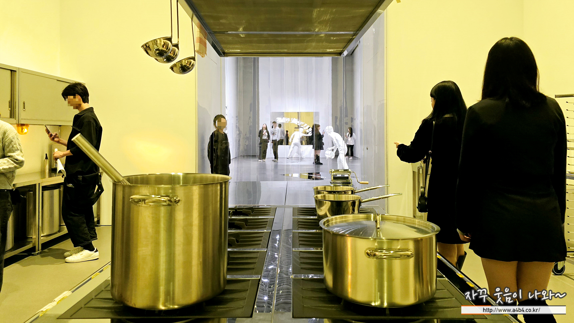 레스토랑을 지나 벽 중앙의 문을 열고 들어가면 주방 공간이 좌우로 길게 펼쳐진다. 냉장고, 작업대, 가스버너 등 각종 주방 기구를 비롯해 실험실에서 볼 법한 작은 소품들이 혼재되어 있다. 엘름그린 & 드라그셋은 대규모 설치 작업에 있는 한 공간이 다른 공간으로 거의 완벽하게 전환되는 방식을 자주 탐구하며, 그 과정에서 예상치 못한 두 공간 사이의 유사점을 강조한다.