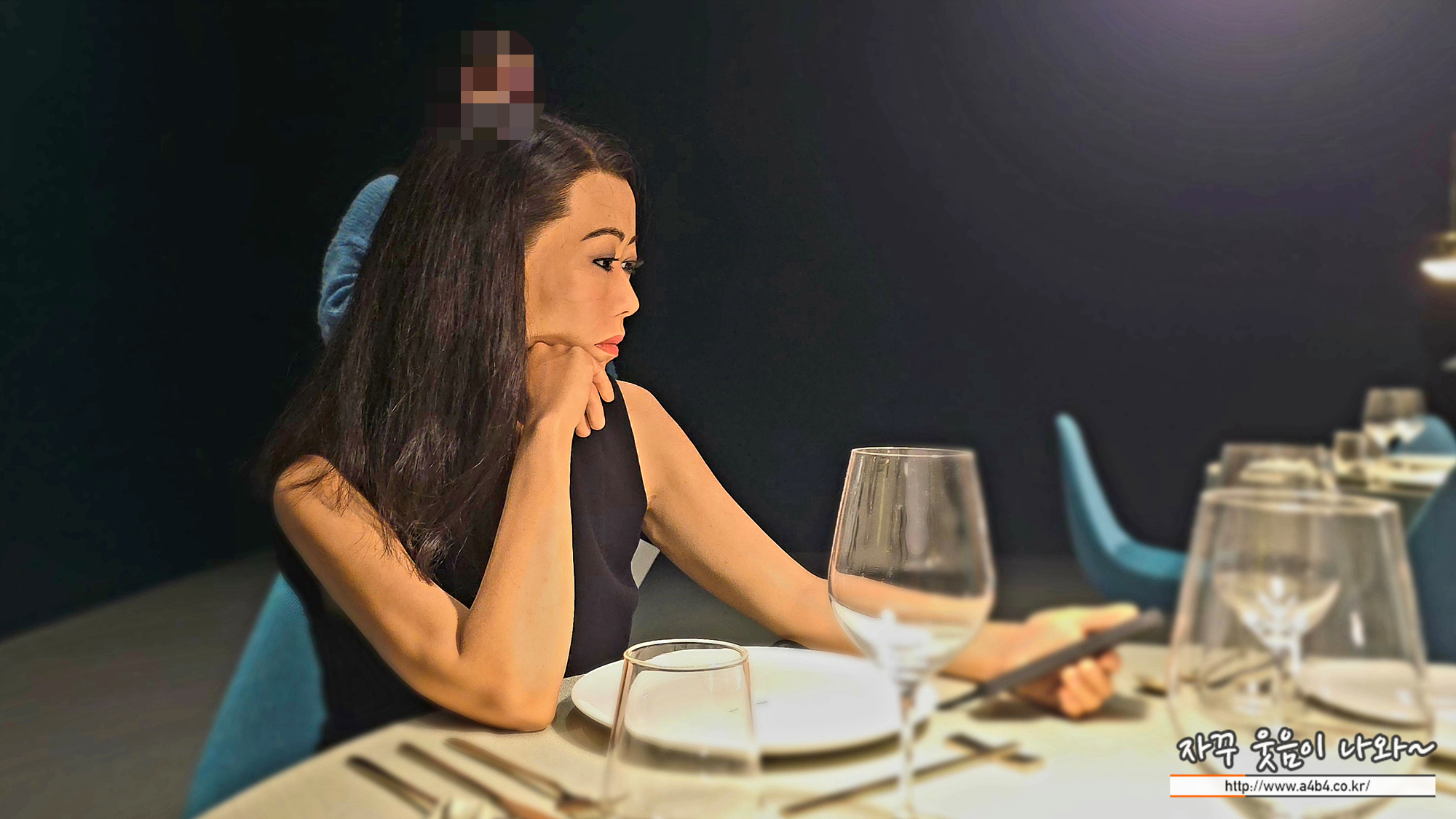 식사 공간으로 들어서면 극사실적으로 묘사된 여성 조각이 레스토랑 테이블에 홀로 앉아 영상 통화에 깊이 몰두하고 있다. 그녀가 대화하는 가상의 친구는 최근 실패한 연애에 대해 독백을 이어간다.