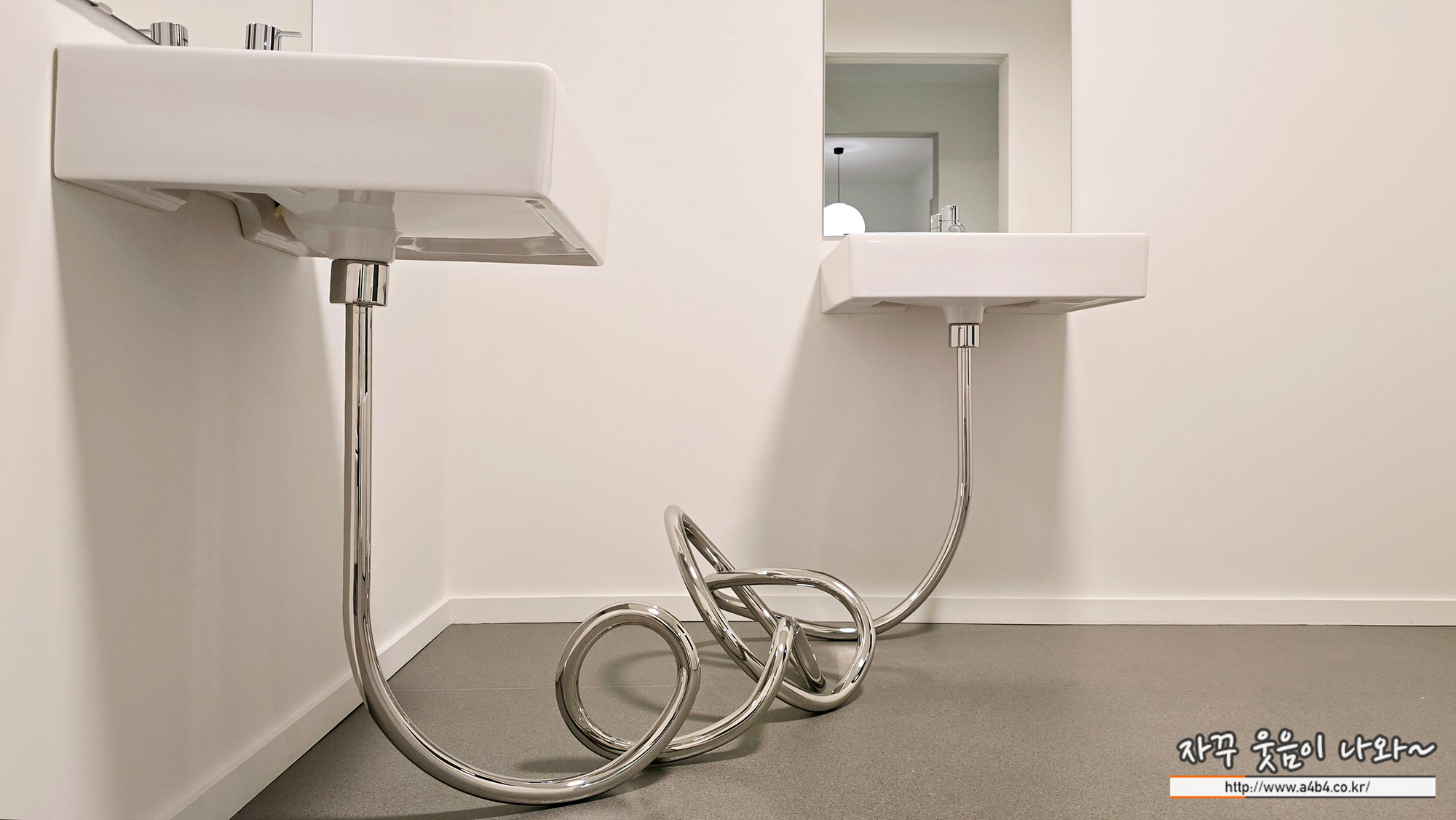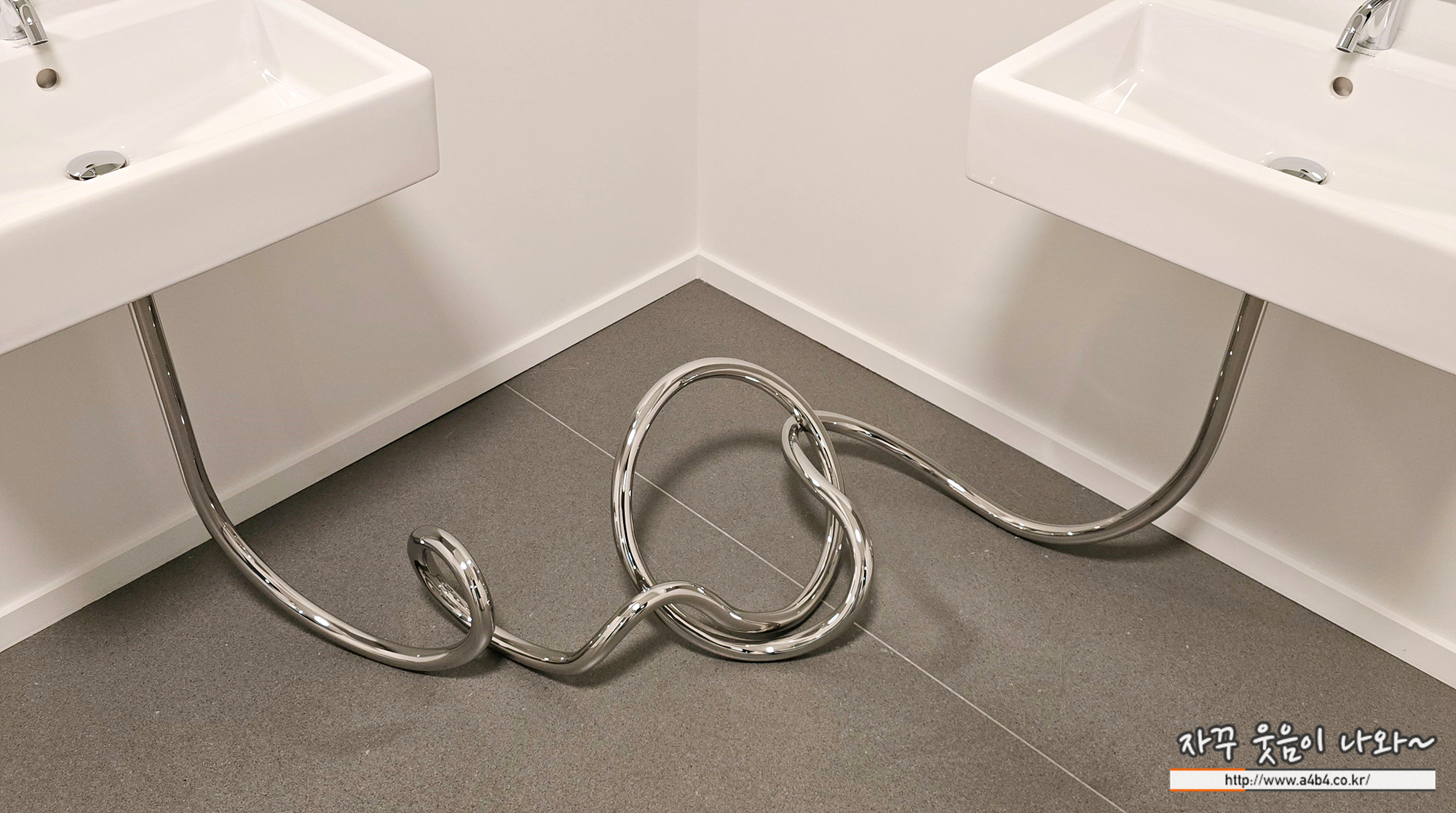 화장실 안에는 범상치 않은 작품이 평범한 기물 사이에 숨겨져 있다. '헤어지다'라는 제목의 작품은 서로 맞닿아 있는 두 개의 동일한 세면대와 거울로 이루어져 있다. 두 세면대는 길고 구불구불한 강철 배수관으로 복잡하게 연결되어 있다. 이 조각은 2004년에 시작된 '결혼'연작의 일환으로, 사람 관계의 복잡성을 다루고 있다.