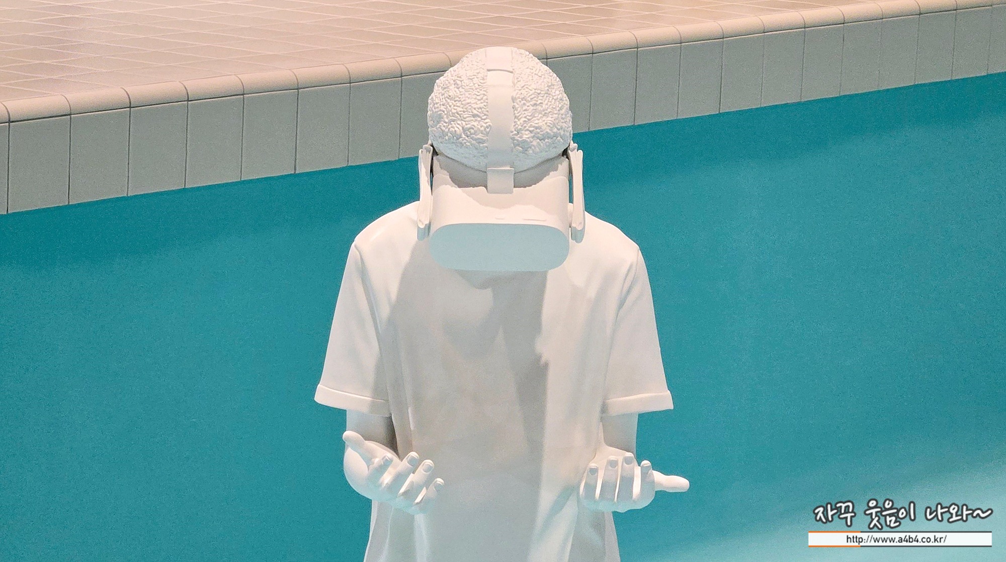 수영장 벽에는 대리석으로 제작된 구명환이 걸려있다. 일반적으로 플라스틱과 같이 가벼울 재질로 제작되는 구명환은 대리석으로 제작되어 고전 조각과도 같은 지위를 획득했다. 구명환은 인간의 취약함을 상기시키지만, 동시에 연약한 생명을 살릴 수 있는 도구이기도 하다. 이 조각 또한 작가들이 전통적인 기호나 오브제를 변형하여 일상적인 의미를 재고하게 하는 연작에 포함된다.