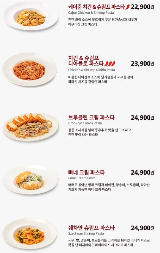 세트메뉴를 먹다 보니 TGIF 할인 또는 추가 프로모션을 받지 못하네요. 약간 억울하기도 하고 4인이 먹기에 부족해서 메뉴 하나 추가합니다. 추가로 김치 아보 필라프를 먹으려고 했다가 가격인 19,000원 대여서 프로모션 조건에 맞지 않아 주문한 메뉴 케이준 치킨 슈림프 파스타 가격은 22,900원. 약간 맵다고 했는데 맵지 않아요.