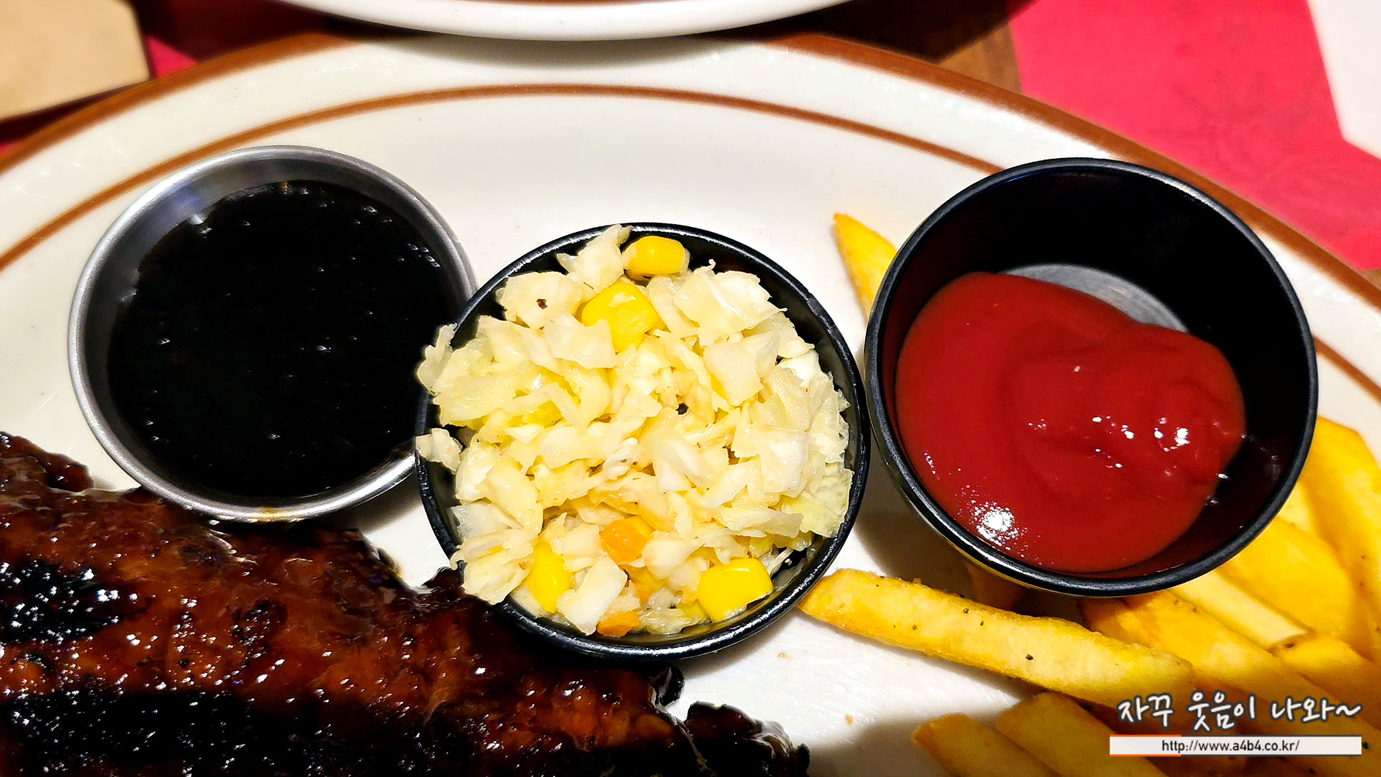 강한 바베큐 소스로 만든 바베큐 폭립입니다. 사진은 2인 메뉴인데요. 소스와 캐첩 그리고 코온슬로가 나옵니다.