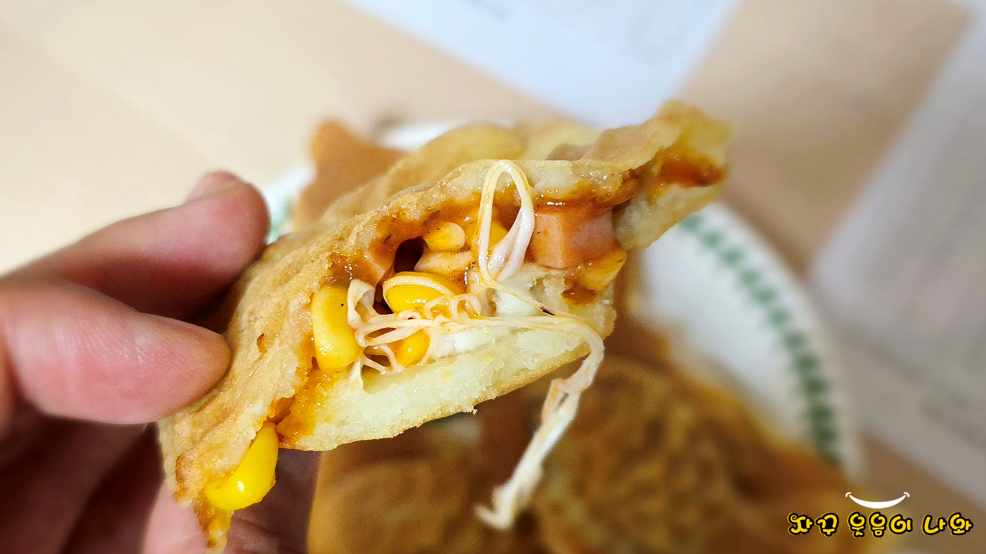 콘과 햄 등이 피자소스와 함께 들어가고요. 위에 큼직한 치즈가 들어가 있습니다. 뜨거울때 먹으면 정말로 빠리바게뜨 같은 빵집에서 파는 피자빵보다 훨 맛있다는...