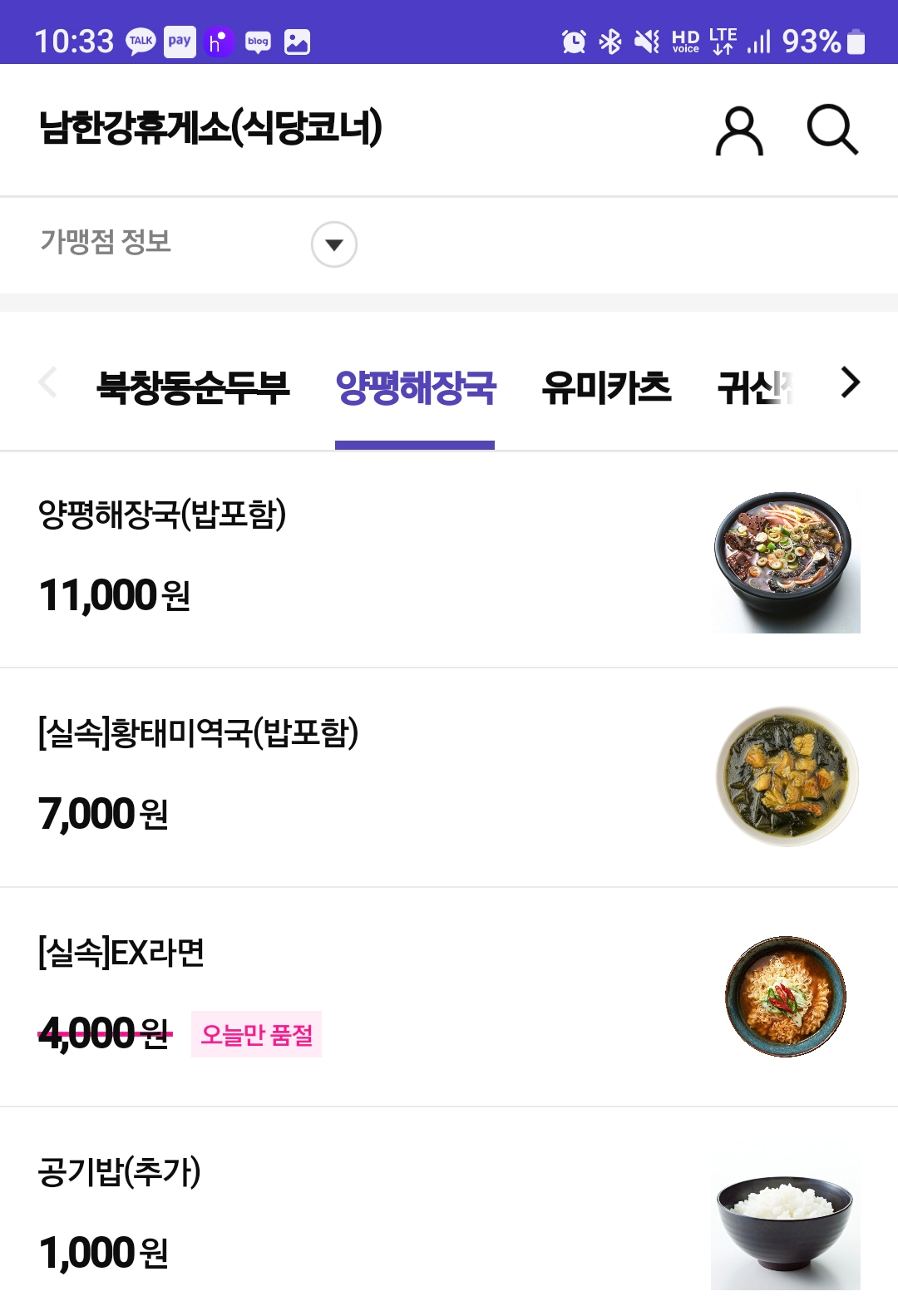 | 남한강휴게소 메뉴 및 가격
