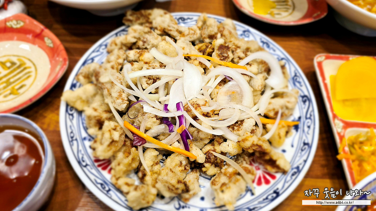 탕수육 위에 생양파가 올라가 있으니, 양파 싫어하시는 분들은 미리 말씀하세요.