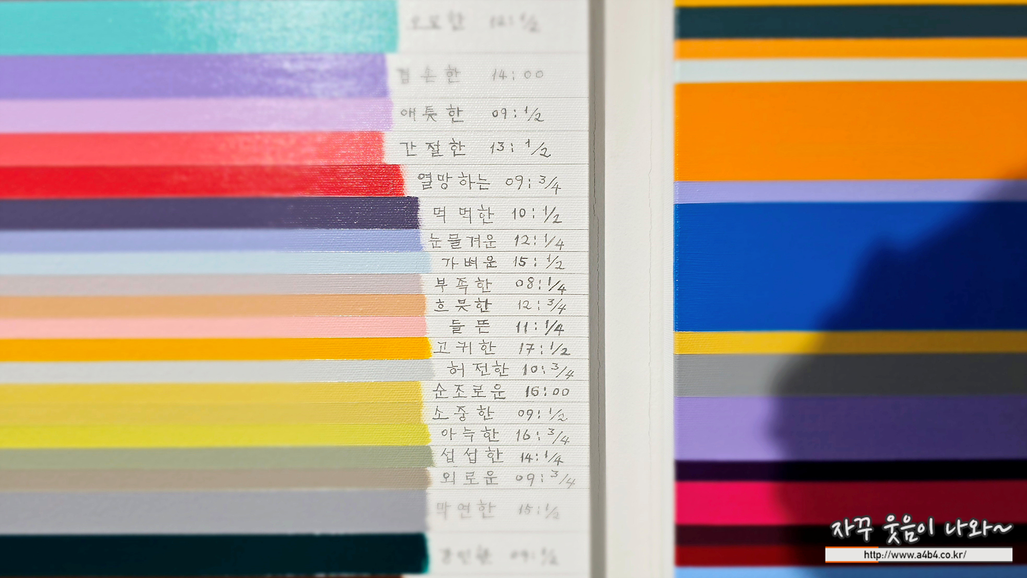 작품 속 언어와 반복되는 색의 면은 의미 있는 질서로 연결되어 과거에서부터의 시간을 한 페이지로 그려내고 있다