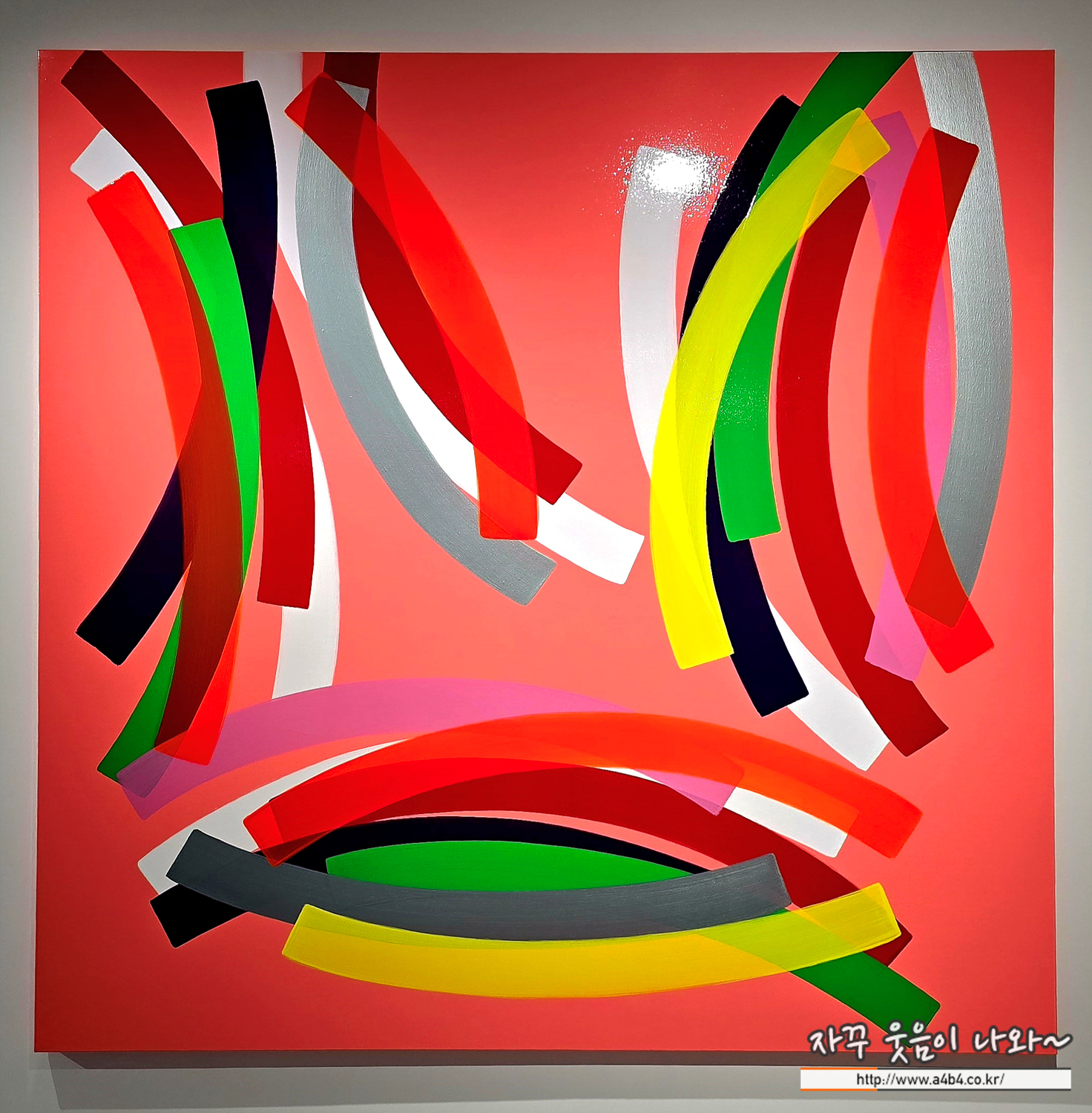 하태임 작가의 작품은 수많은 색 위로 색띠들이 중첩되어 정제된 화려함과 세련함을 구성하고 있다.