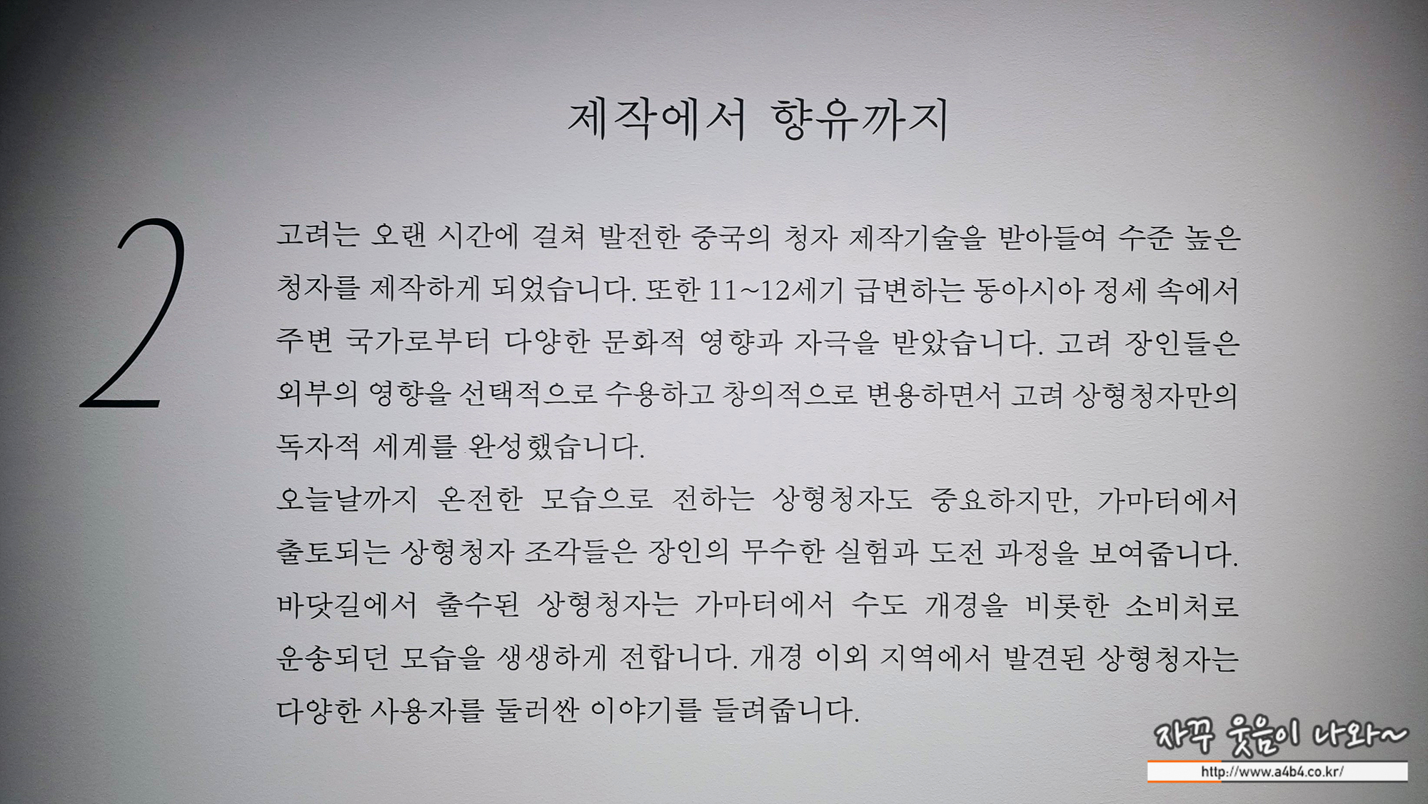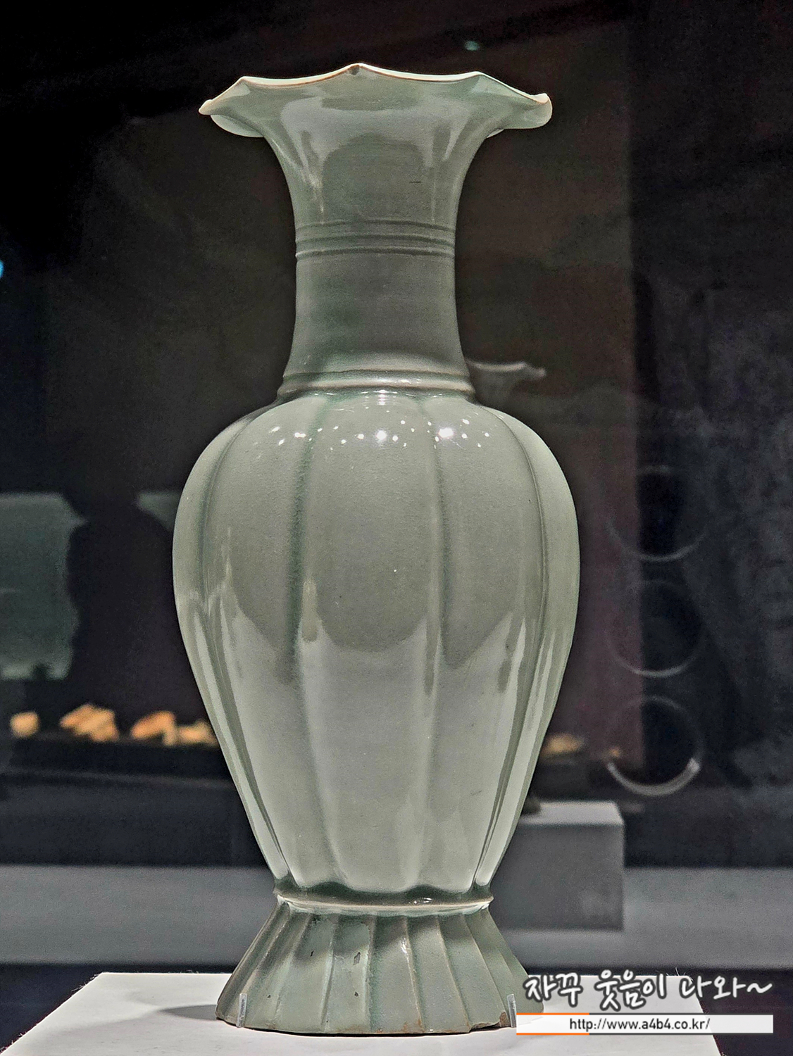 전시장 입구에는 한 점의 고려청자가 전시되어 있습니다.