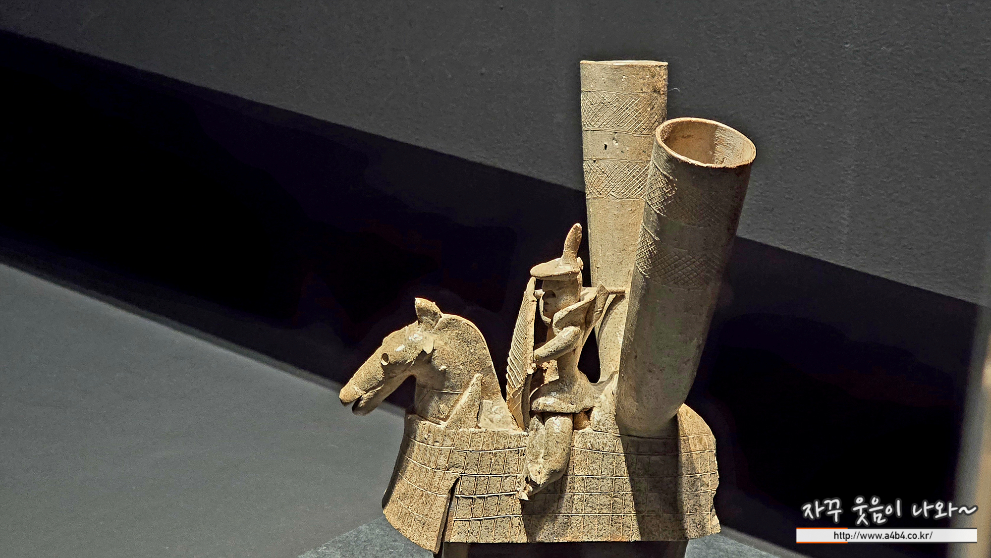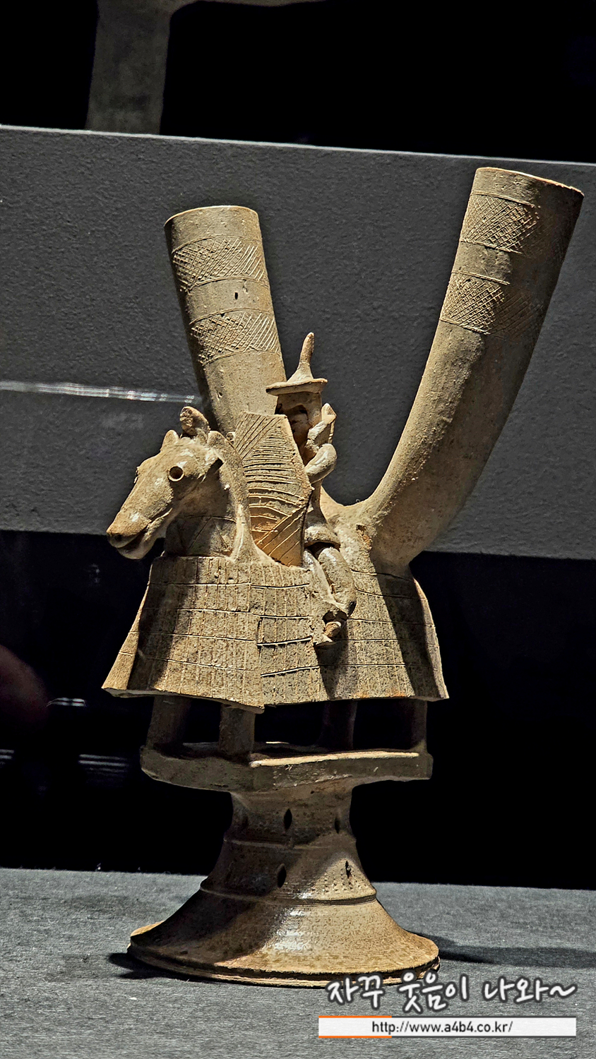 말을 타고 있는 무사를 형상화하였습니다. 무사, 말을 감싼 비늘갑옷, 말 엉덩이 위의 뿔잔 등을 서로 붙여 완성하였습니다.