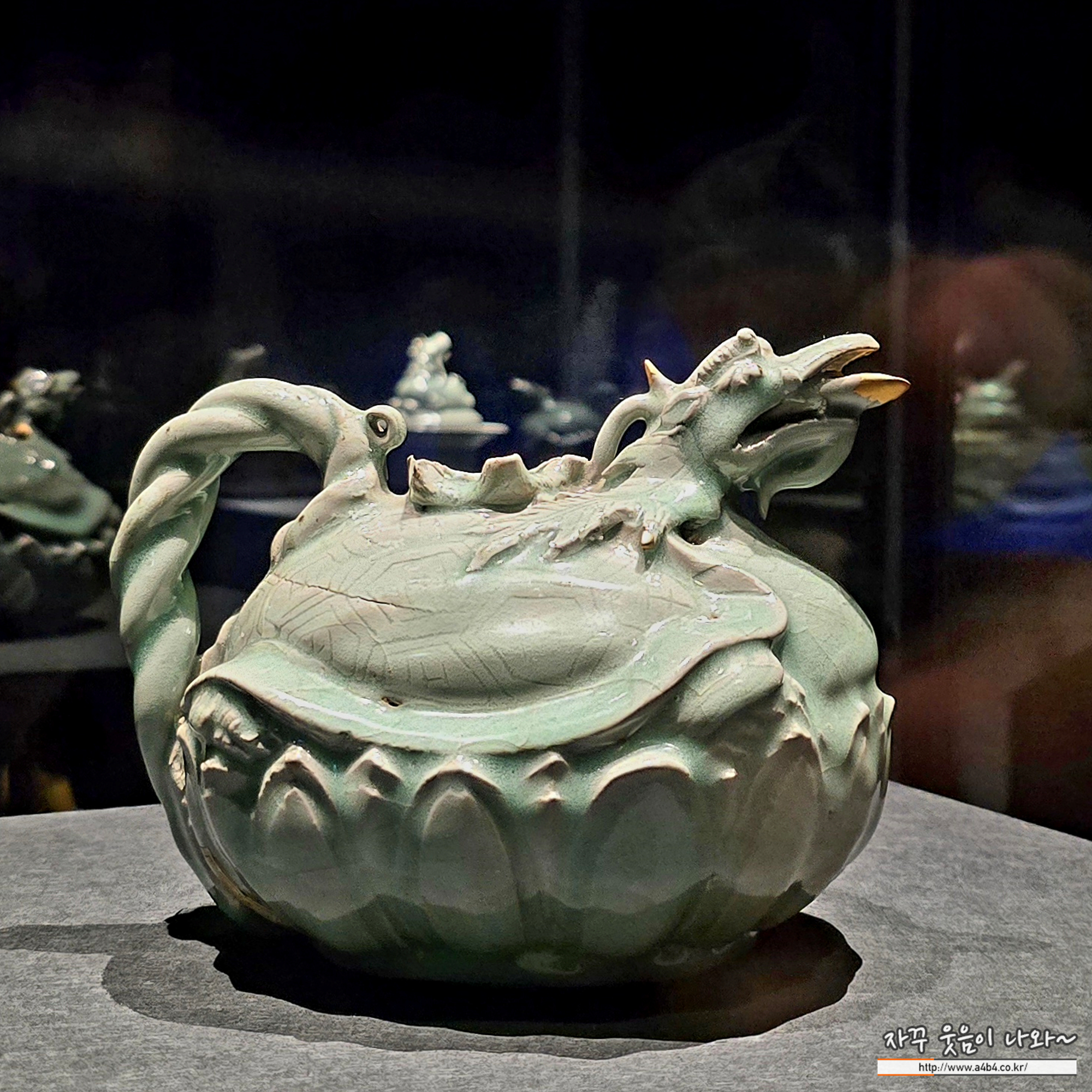 물을 담고 따르는 주자입니다. 용의 머리에 거북 몸을 결합한 상상의 동물인 귀룡이 연꽃 위에 올라가 있습니다. 귀룡은 고개를 들고 입을 벌려 포효하는 듯합니다. 세밀하게 음각한 비늘과 뿔, 발톱이 맑고 투명한 비색 유약 아래로 생생하게 드러납니다. 눈과 손잡이에는 철 안료로 점을 찍어 생동감을 더했습니다.