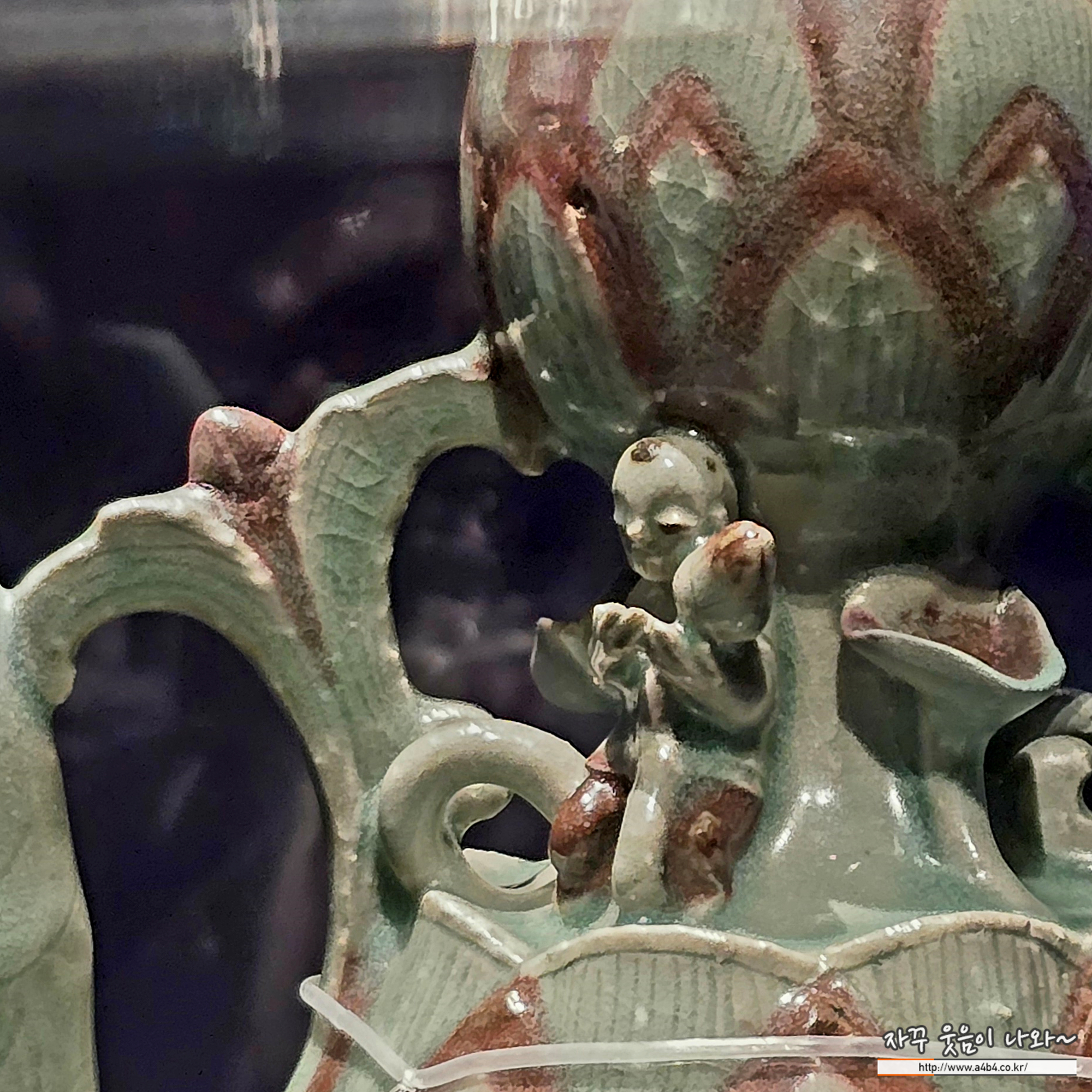 아래쪽 몸체와 위쪽 뚜껑은 연꽃모양이고, 그 사이 움푹한 곳에 연꽃 줄기를 들고 있는 동자모양 장식이 있습니다. 손잡이 위의 개구리는 뚜껑에 달린 작은 벌레를 응시하는 듯합니다. 동화銅畫기법으로 그린 붉은 무늬가 청자의 색과 대비되어 화려함의 극치를 이룹니다. 1257년(고종高宗 44) 사망한 무신정권의 권력자 최항崔沆의 무덤에서 나왔다고 하여 당시 권력자들의 취향을 엿볼 수 있습니다.
