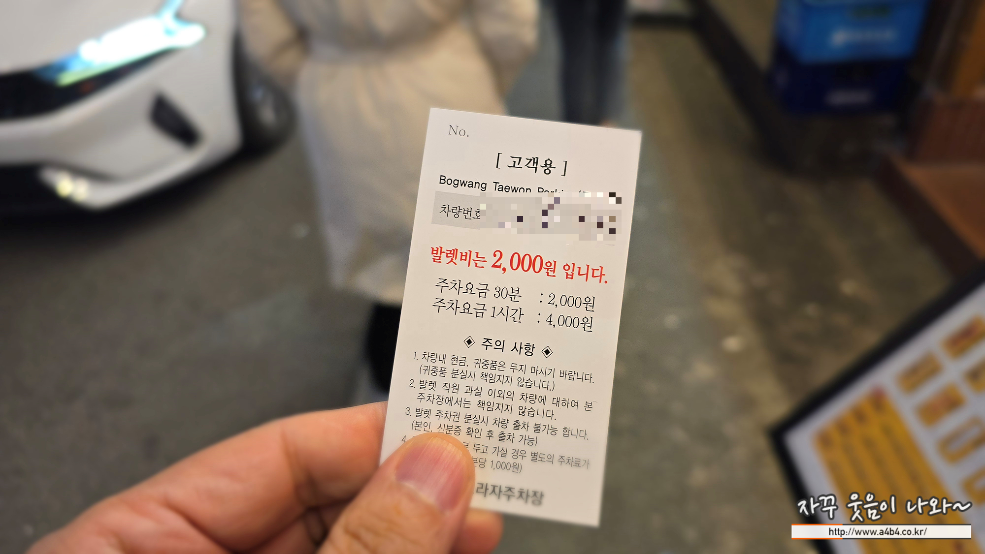 주차장은 발렛을 이용해야 해서 입차시 2,000원 지불해야 하고요. 주차요금은 30분당 2,000원 부과됩니다. 만약 한 시간 1분 이용해도 6,000원 주차요금 부과됩니다.