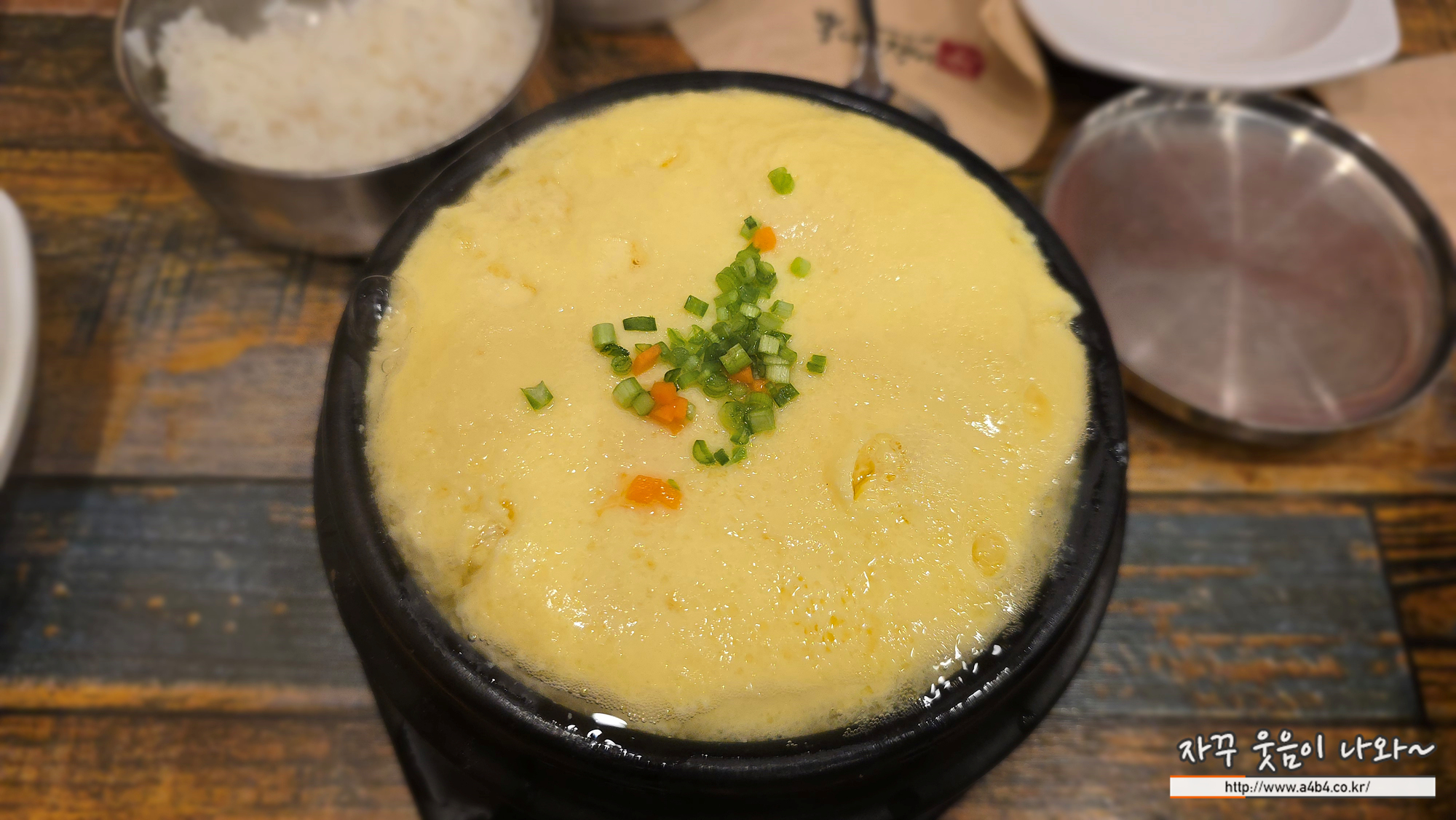 공기밥 가격은 1,000원 인데요. 밥이 떨어졌다고 햇반인데 주문하시겠냐고 물어 보시네요. 그리고 이렇게 밥공기에 담아서 나왔습니다. 계란찜 가격은 4,000원 인데요. 계란찜 맛있게 잘 만들어서 나왔네요.