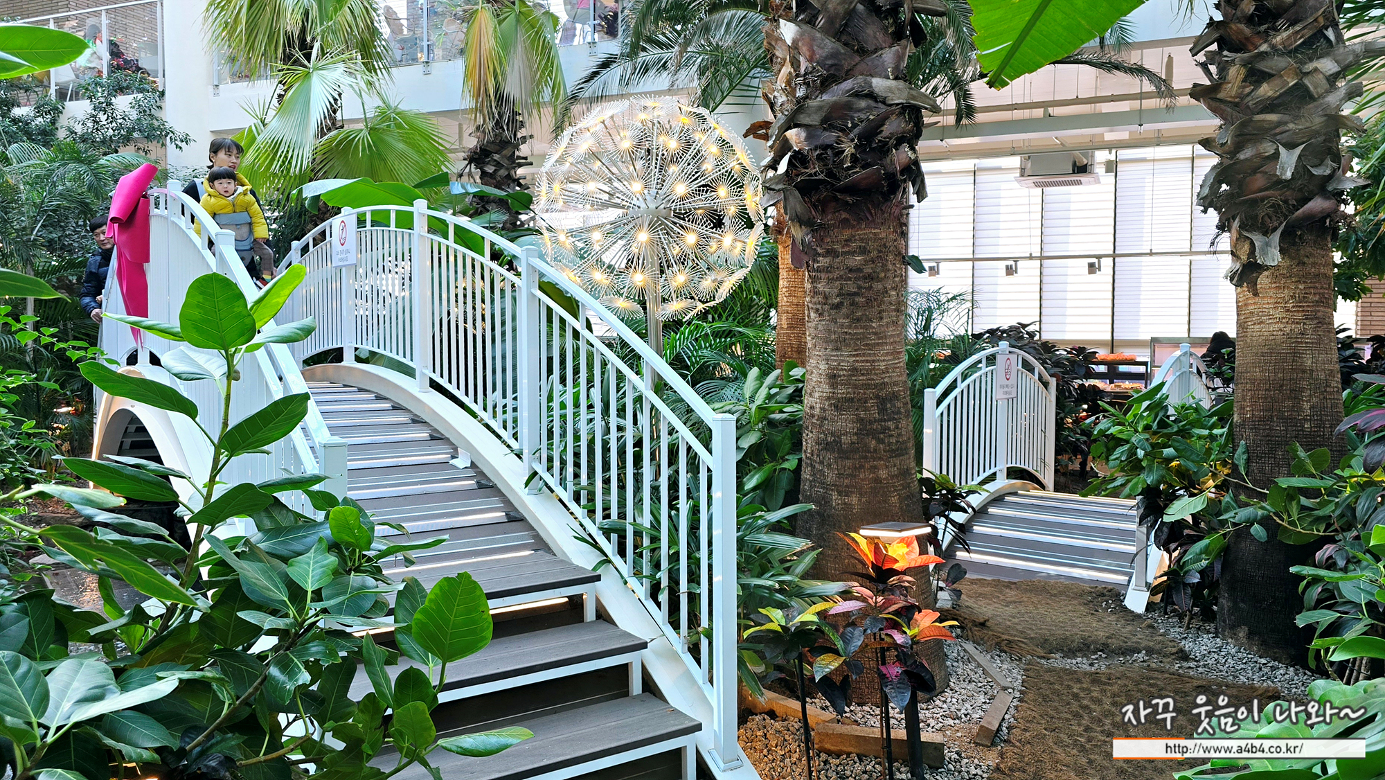 인천 송도 초대형 베이커리 카페 포레스트 아웃팅스 1층에는 구름다리와 작은 분수, 연못 등이 세팅되어 있습니다. 도심에서 거대한 온실안에 열대 나무와 식물을 보면서 여유를 가질 수 있고 곳곳에 이쁜 포토존도 마련되어 있습니다.