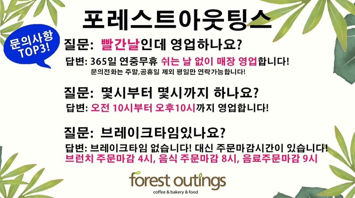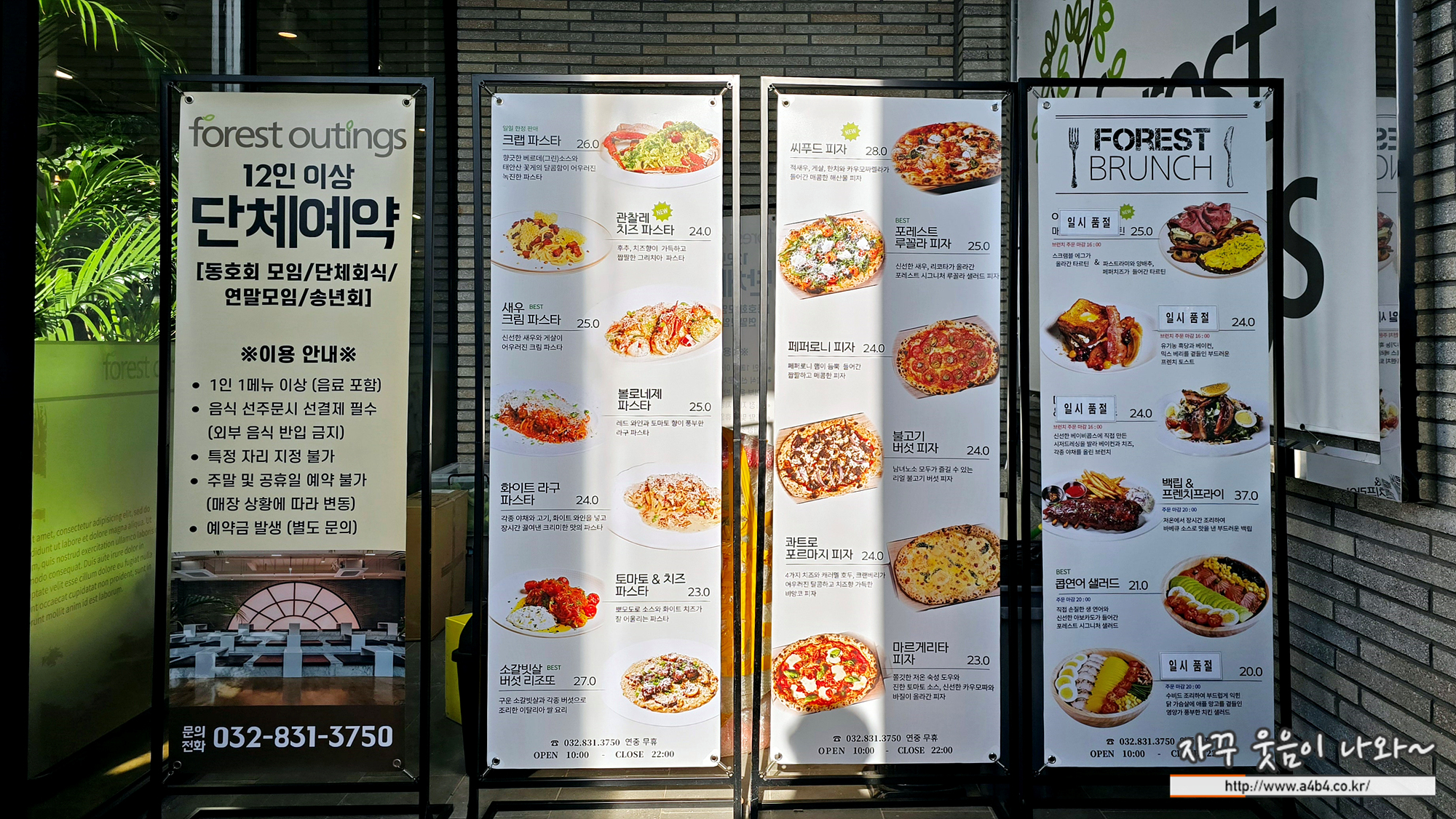 송도 포레스트 아웃팅스 휴무일 없이 365일 연중무휴로 운영됩니다. 영업시간은 10시 부터 22시까지 운영되며, 라스트 오더는 음식은 20시, 음료는 21시 입니다.