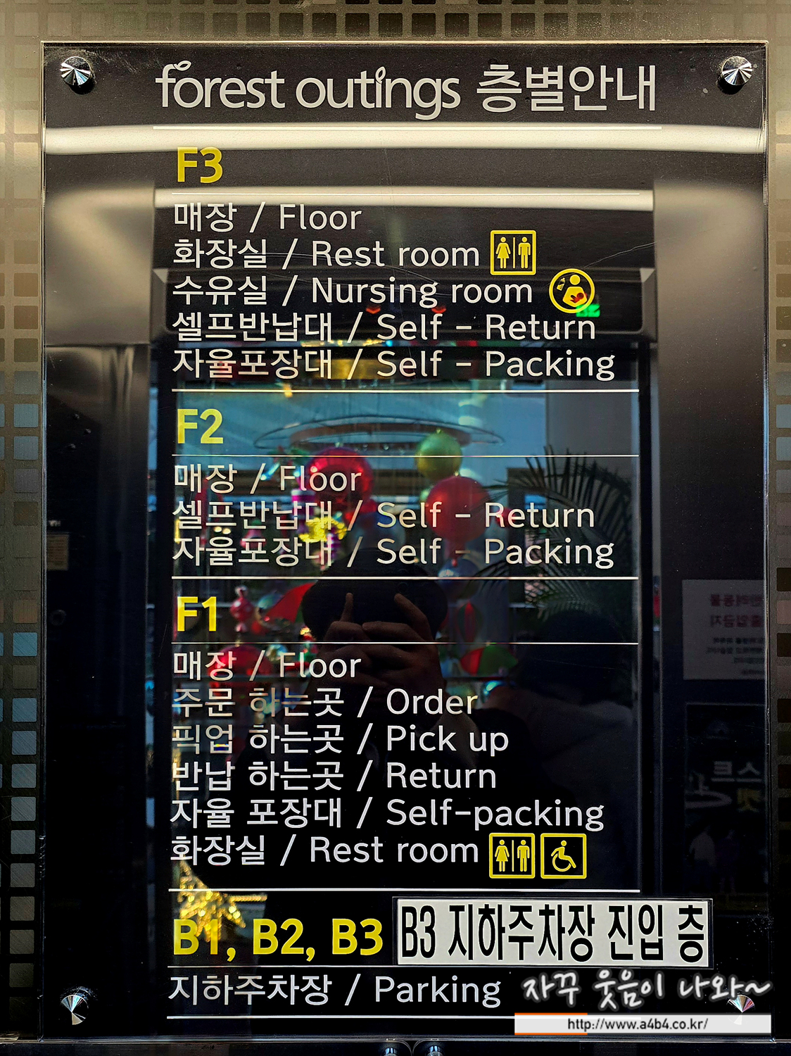 포레스트 아웃팅스는 지하층은 주차장 1층 부터 3층까지는 매장으로 구성되어 있습니다. 특히 3층은 수유실이 준비되어 있고요. 각 층에는 셀프반납대와 자율 포장대도 마련되어 있네요. 음식 및 음료 주문은 1층에서 하시면 됩니다.