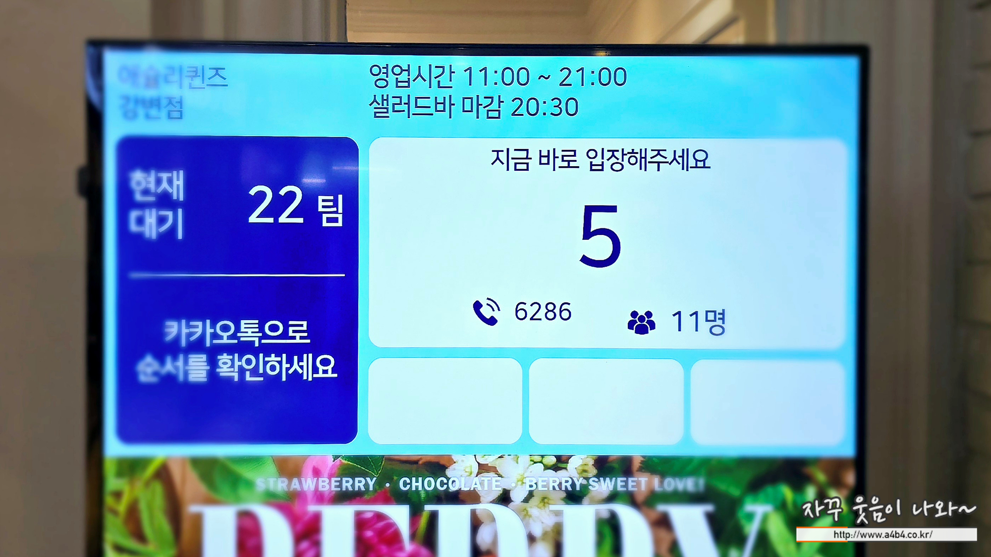 저희는 오후 1시 40분 경에 식사를 마치고 나왔는데요. 해당 시간에는 22팀이 에슐리퀸즈 딸기축제를 위해 웨이팅 중이었네요. 역시 사전예약하고 방문하시는 것을 추천 드립니다.
