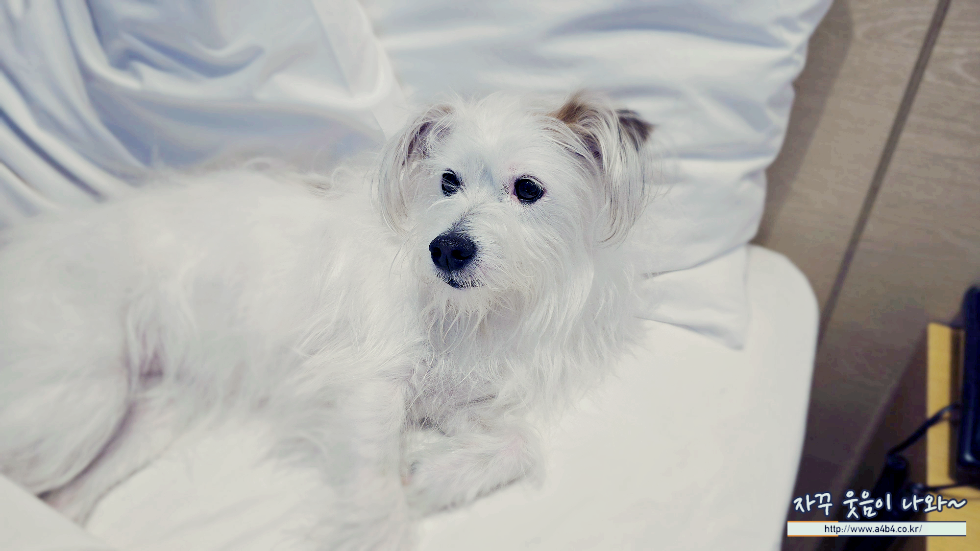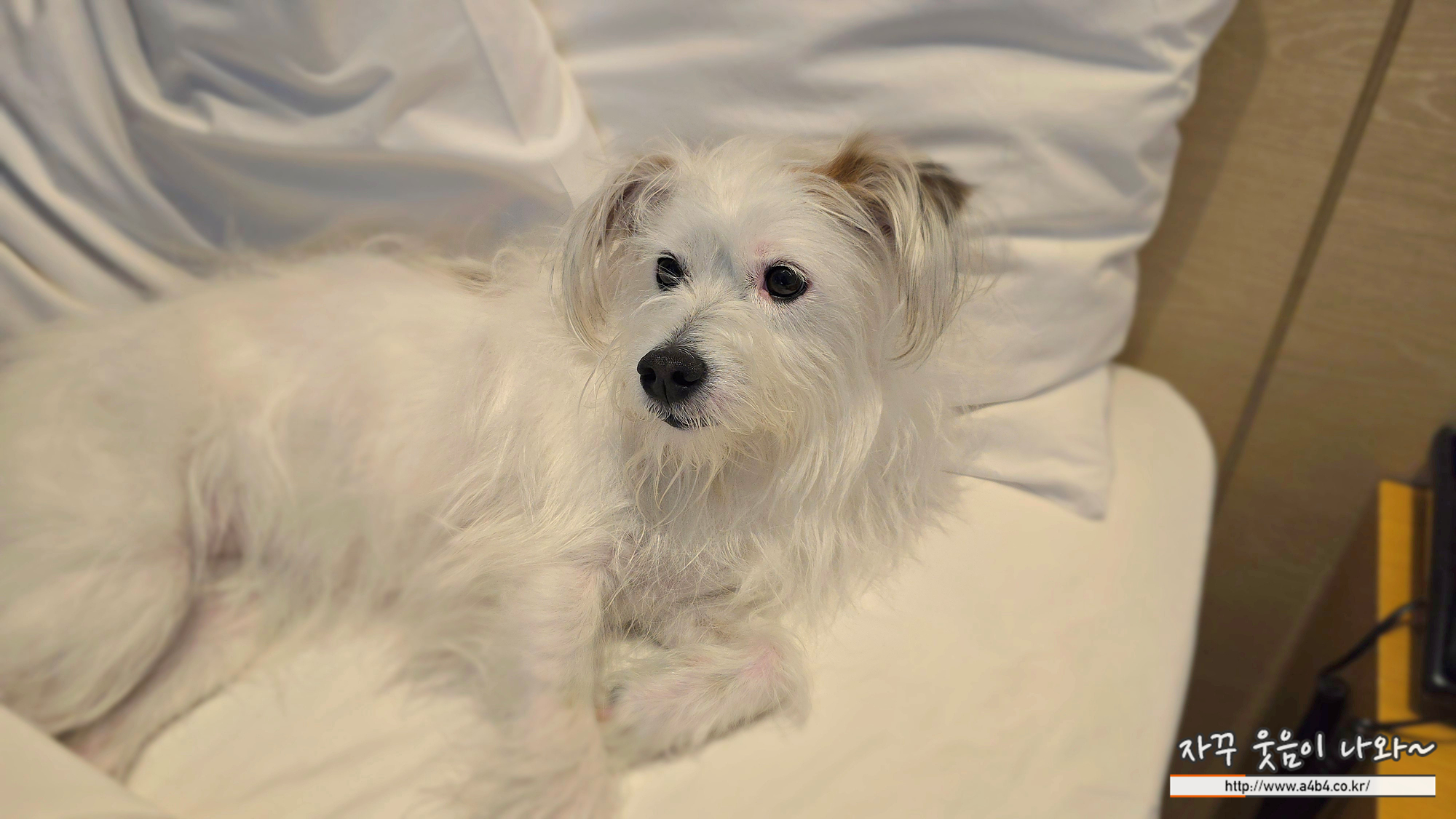 우리집 강아지 설탕이는 호텔방으로 들어오자마자 쪼르르 침대로 올라가서 자리 잡네요. 어이가 없어서...