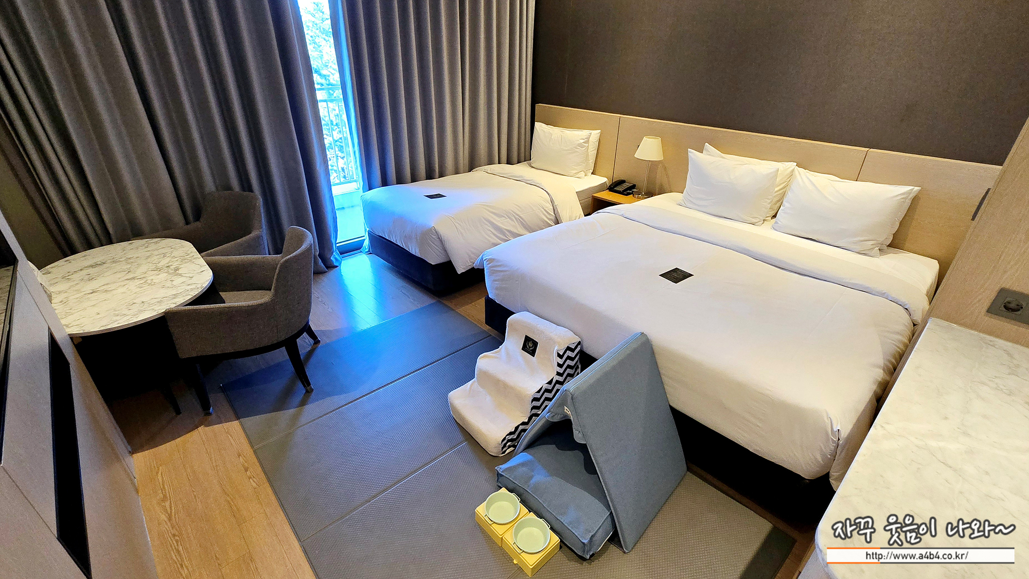 저희는 강릉 세인트존스호텔 펫룸 3인 + 반려견 한마리 조건으로 예약해서 침대는 더블과 싱글침대 두 개가 나란히 배치되어 있습니다. 침구 컨디션은 양호하고 침대는 약간 하드한 타입으로 제가 좋아하는 타입입니다. 세인트존스 호텔 침대 컨디션은 만족...
