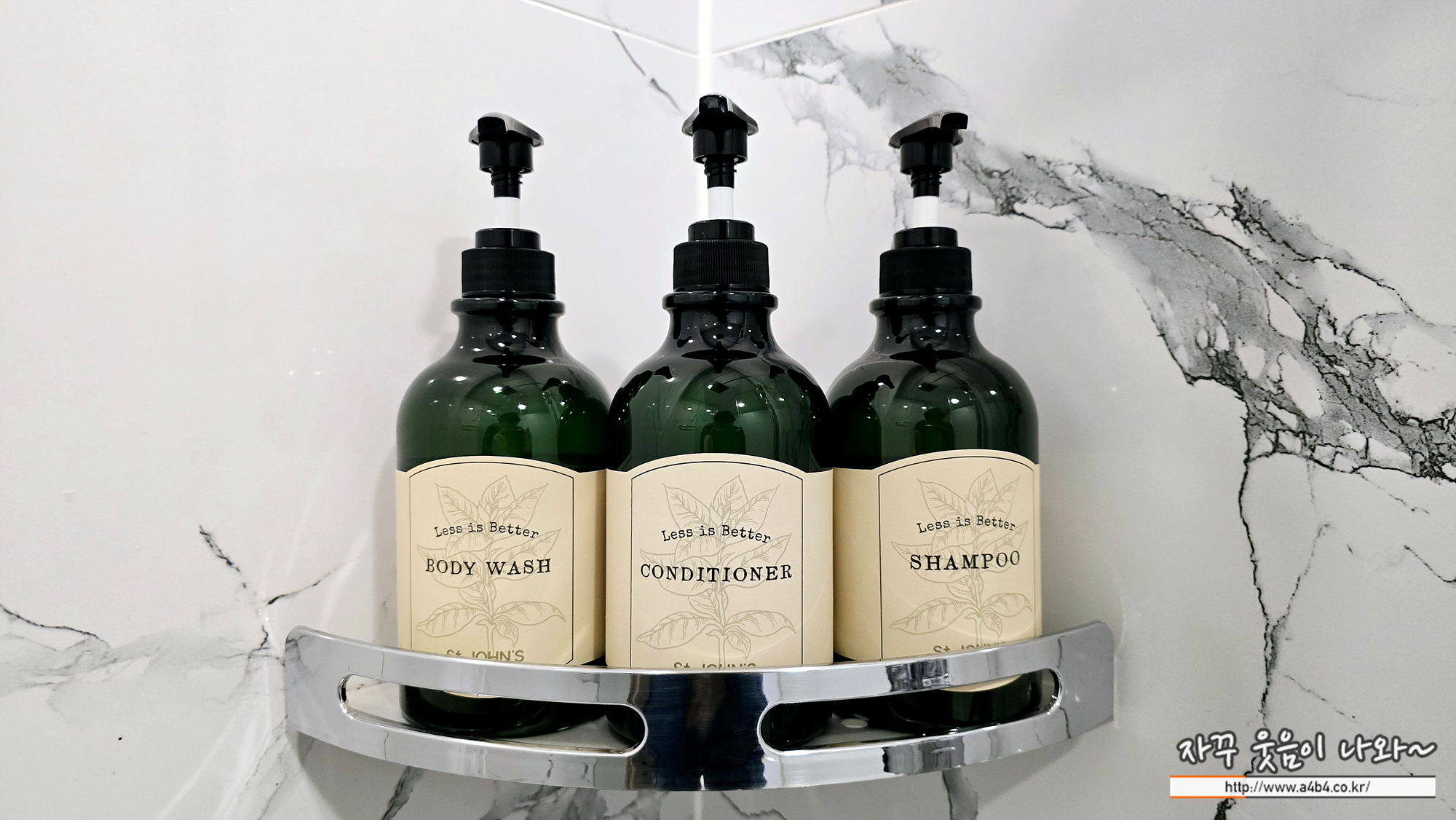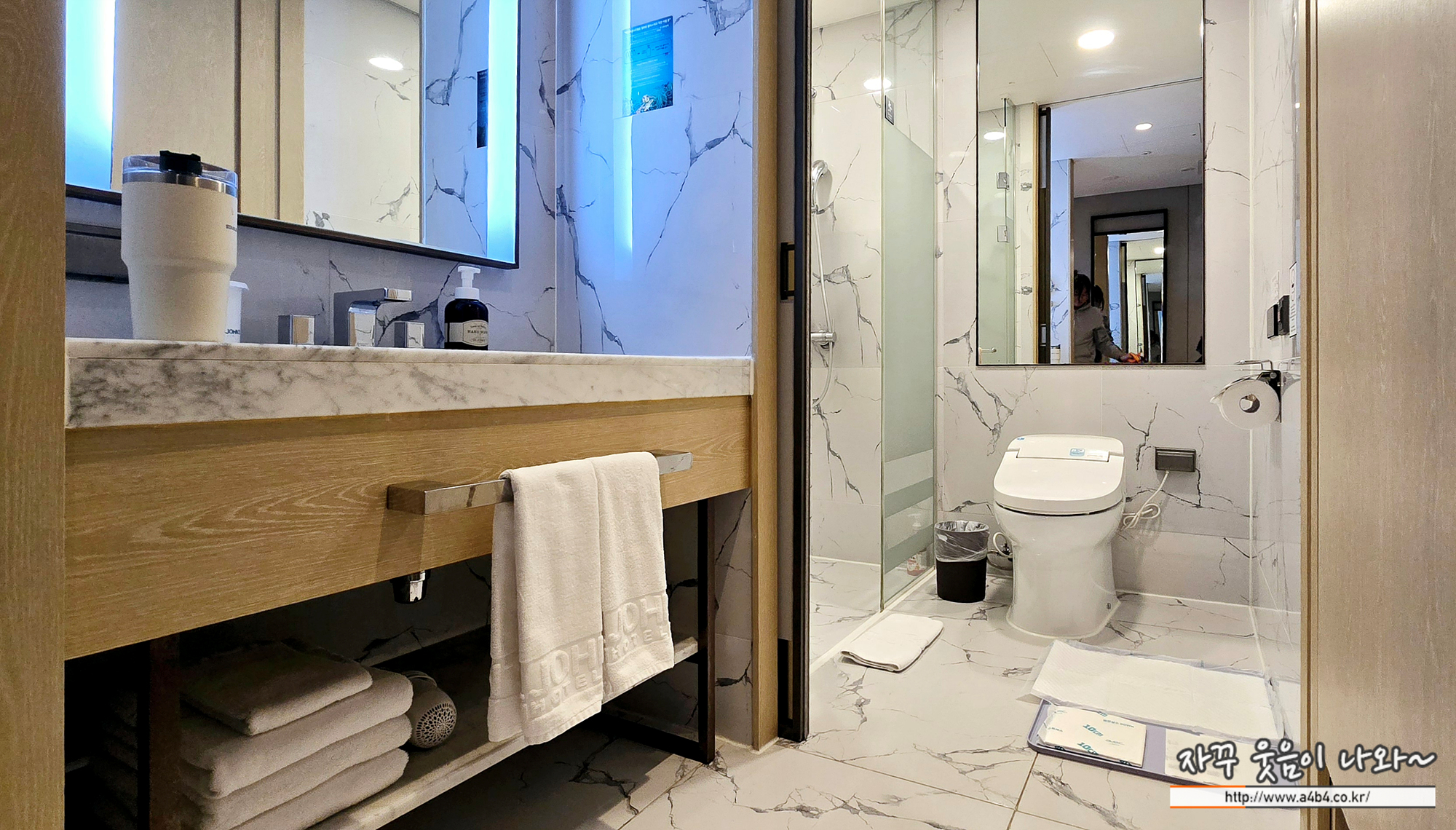 샤워부스에 욕조는 없고요. 샴푸와 린스, 바디워시가 준비되어 있습니다. 그리고 바닥에는 강아지 전용 샴푸겸용 린스가 준비되어 있네요. 세인트존스호텔 펫룸 패키지 예약하면 강아지용 하누끼탕이나 드라이룸 서비스가 있다고 했는데 저희는 서비스 받지 못했습니다.