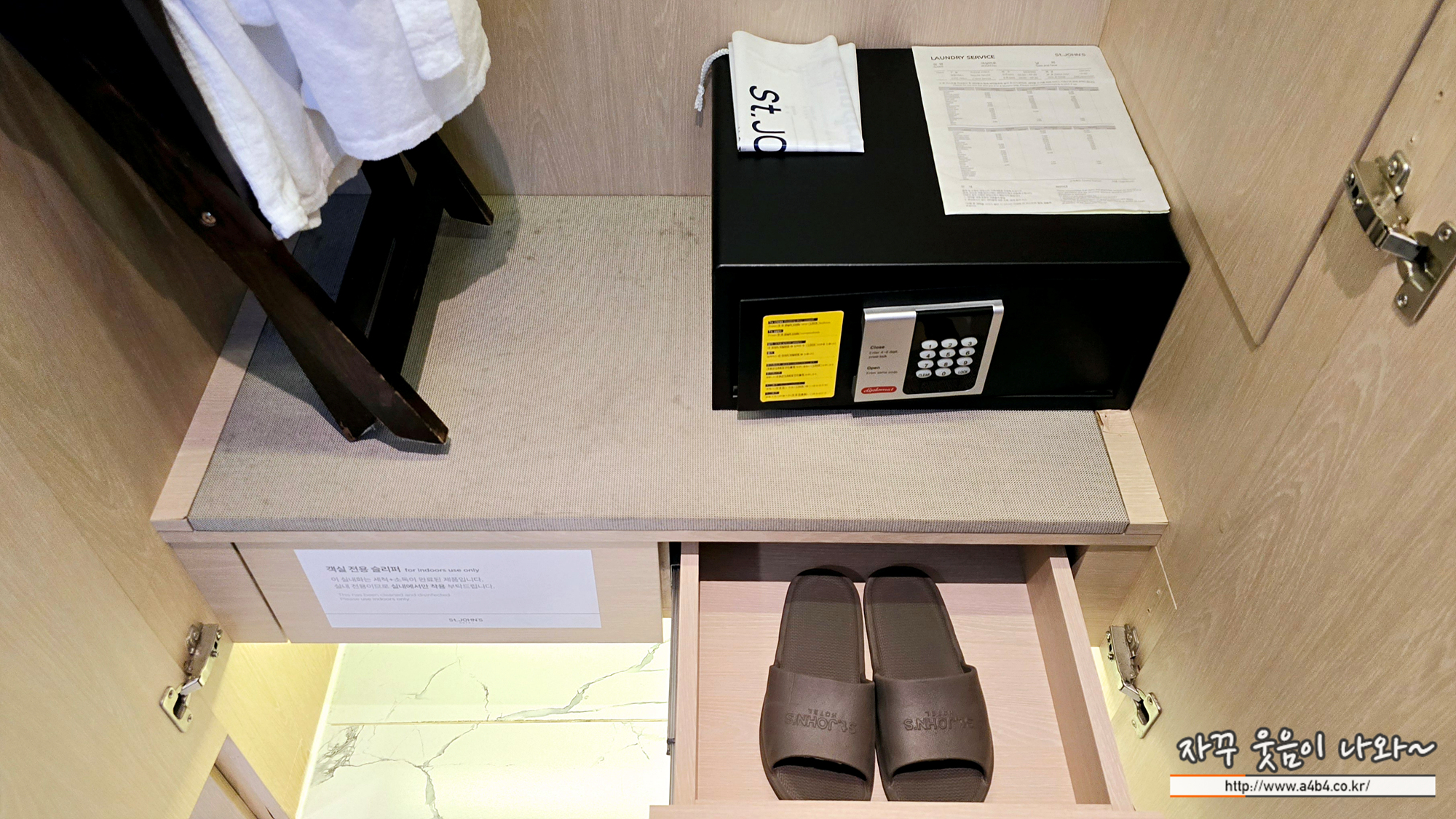 옷장에는 샤워가운과 러기지랙, 소형금고가 준비되어 있고요. 슬리퍼는 3쌍이 비치되어 있습니다.
