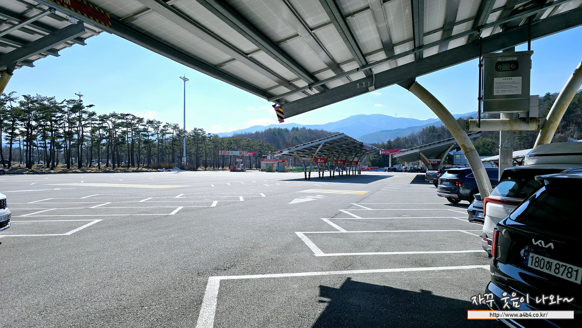 주차장은 사진과 같이 일요일 오후에 방문 했는데, 강릉 대관령휴게소 주차장은 상당히 여유 있었습니다. 또한 주차장에 그늘막이 있어 비가오거나 눈이오는 날에도 편하게 승하차가 가능합니다. 또한 사선 주차장으로 옆차에 크게 방해받지 않고 주차는 가능하지만 차간 간격이 여유 있지는 않습니다.