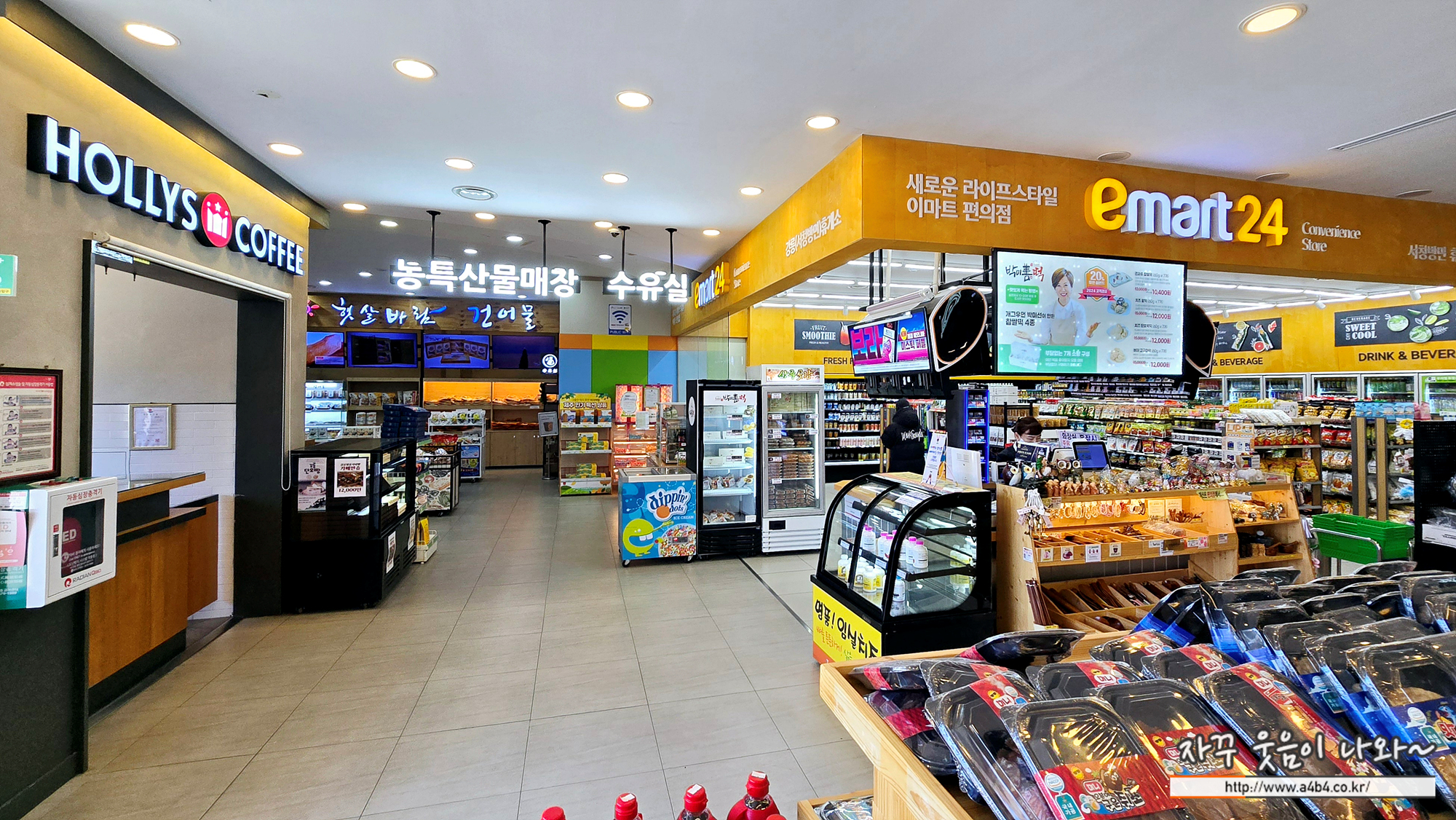 아래와 같이 편의점과 식당, 한식당, 열린식당과 몇가지 먹거리가 준비된 작은 규모의 휴게소 입니다.