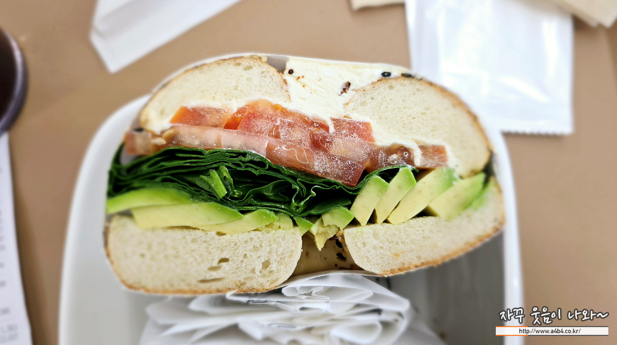 아보카도, 토마토와, 베이비 스피니치,토마토,시트러스 페타치즈 스프레드가 들어있는 베이커리 샌드위치 인데요.