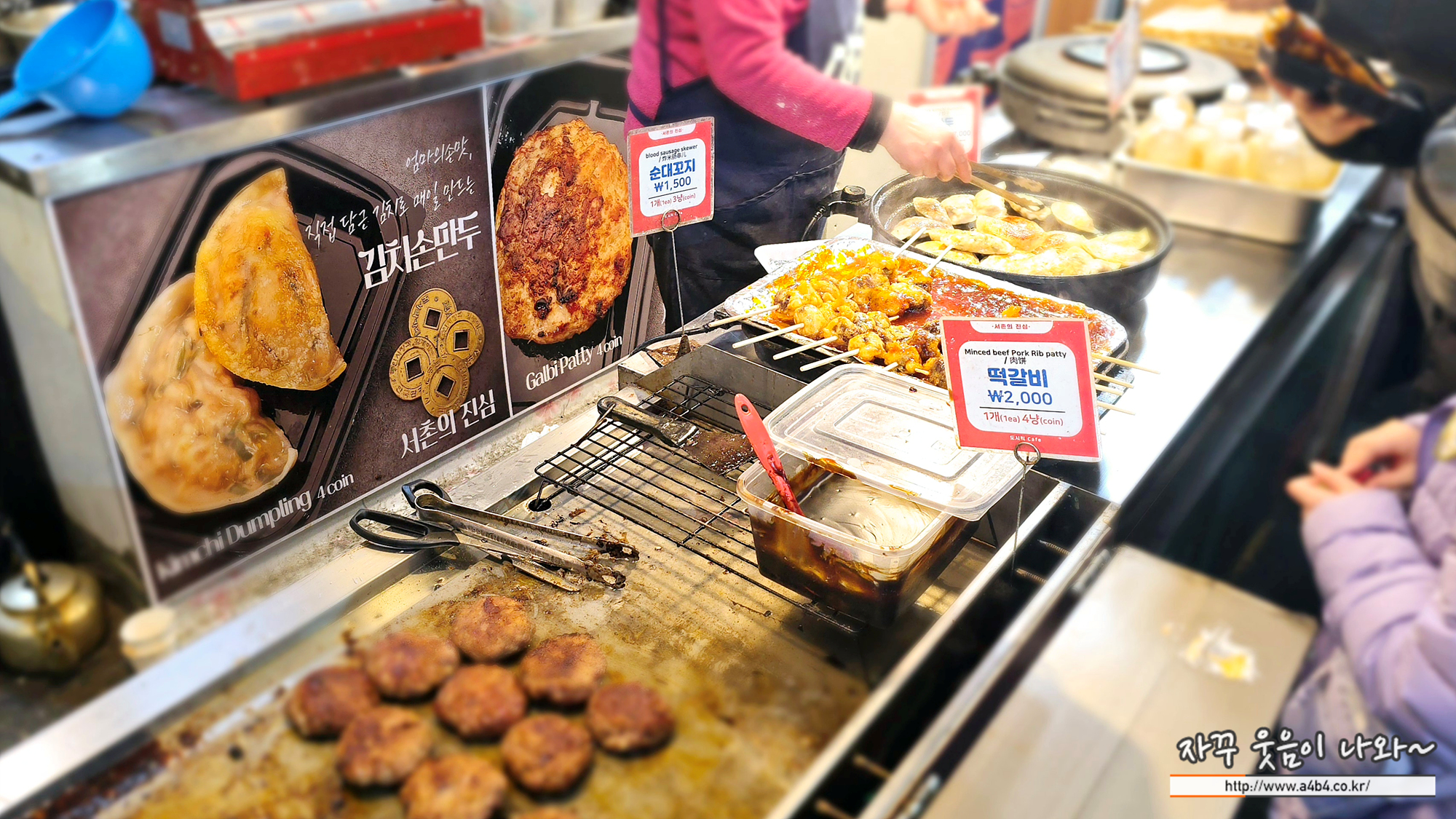 떡갈비 2,000원, 김치손만두 한 개에 1,000원, 순대꼬치 1,500원 등 일반 시장에서는 하나씩 맛보기 어려운 여러 음식들을 엽전 한두개, 서내개를 내고 담을 수 있습니다.