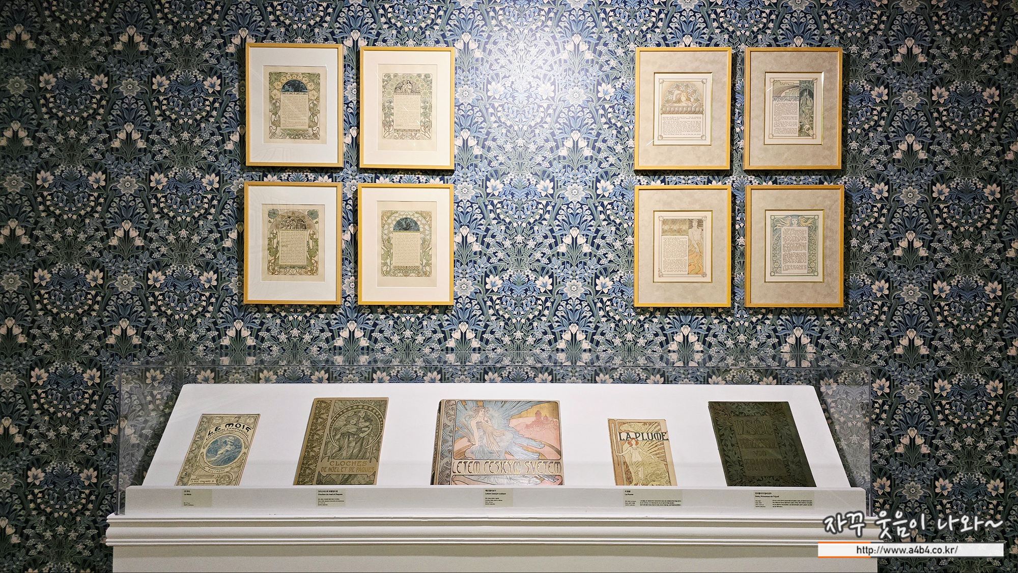 그리고 바로 옆에는 무하가 삽화 작업을 한 책들과 내지들이 전시되어 있습니다.