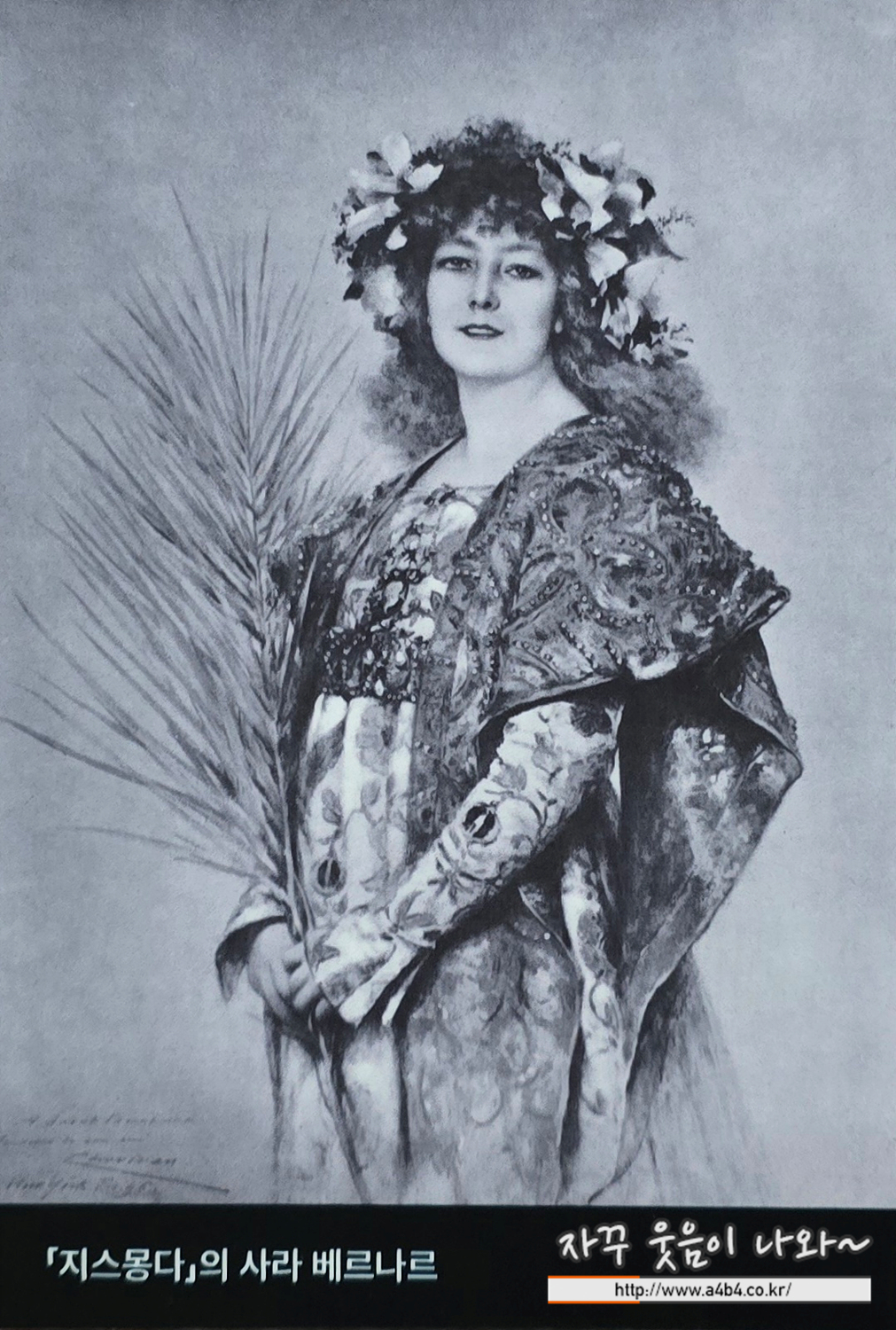 사마리아 여인은 성경을 바탕으로 한 연극입니다. 베르나르는 고대팔레스타인의 평범한 시골 농민으로 등장하며, 기독교로 개종한 후자신의 부족을 새로운 신앙으로 이끄는 역할을 합니다. 이 연극의 첫 공연은 1897년 부활절 시기에 맞춰 예정되었습니다. 무하의 그림에서사라는 3막에서 입는 의상을 하고 거대한 암포라를 들고 있습니다. 앤티크풍 글자와 배우 뒤의 둥근 모자이크 배경 속히브리어 문자는 극의 소재와 방향을 잘 보여주고 있습니다.