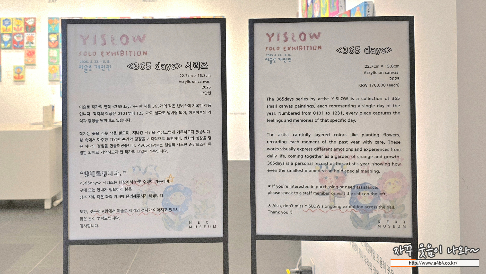 이번 넥스트뮤지엄에서 열리고 있는 이슬로 개인전 : 정원이 된 시간 전시회 < 365 DAYS >는 총 365점의 연작으로, 작품 넘버는 날짜 형식 (0101~1231)으로 구성되어있습니다. 22.7cm × 15.8cm Acrylic on canvas 2025 개당 17만원