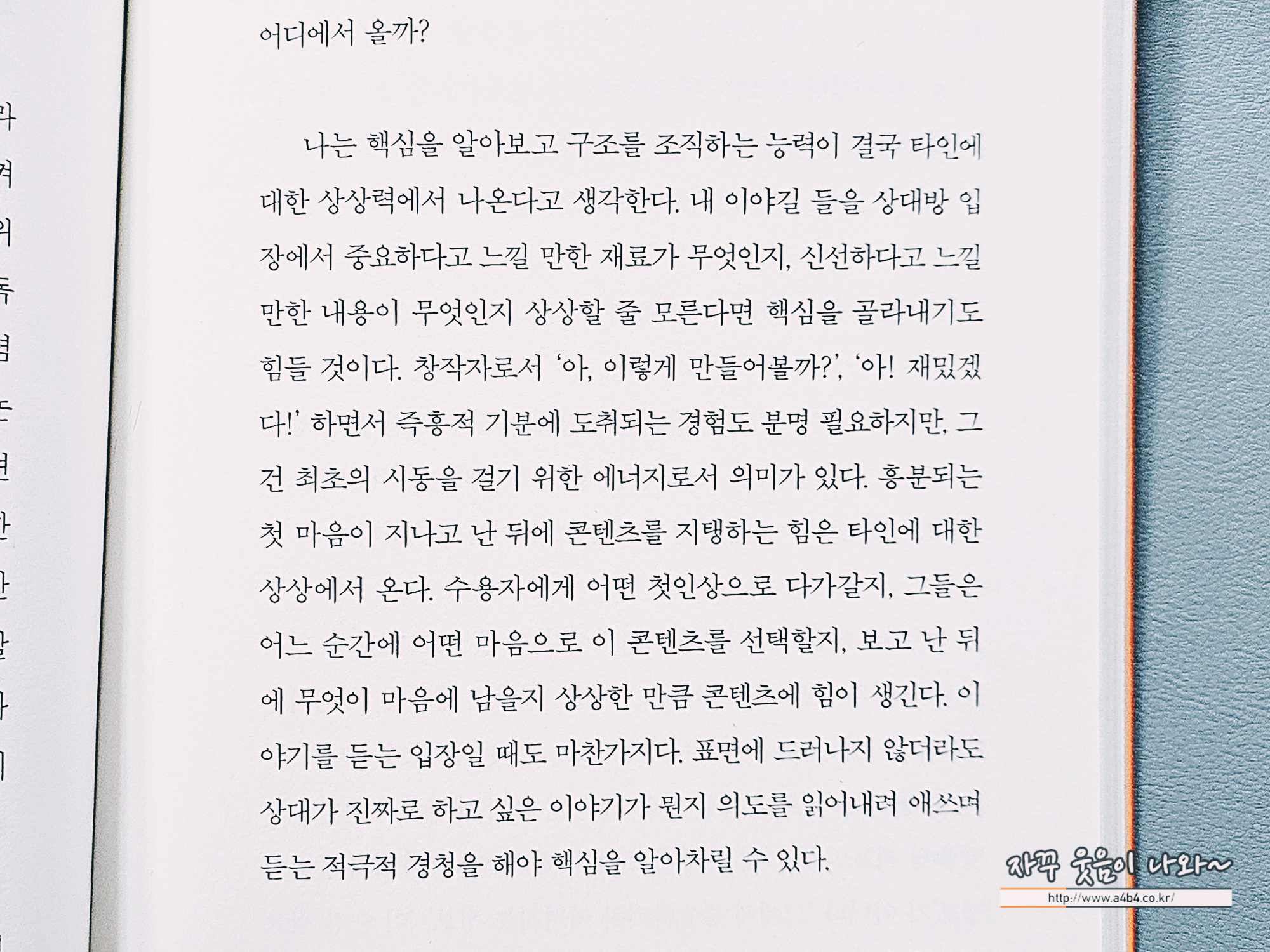 흥분되는 첫 마음이 지나고 난 뒤에 콘텐츠를 지탱하는 힘은 타인에 대한 상상에서 온다. 수용자에게 어떤 첫인상으로 다가갈지., 그들은 어느 순간에 어떤 마음으로 이 콘텐츠를 선택할지, 보고 난 뒤 에 무엇이 마음에 남을지 상상한 만큼 콘텐츠에 힘이 생긴다.이 아기를 듣는 입장일 때도 마찬가지다. 표면에 드러나지 않더라도 상대가 진짜로 하고 싶은 이야기가 원지 의도를 읽어내려 애쓰며 듣는 적극적 경청을 해야 핵심을 알아차린 수 있다.