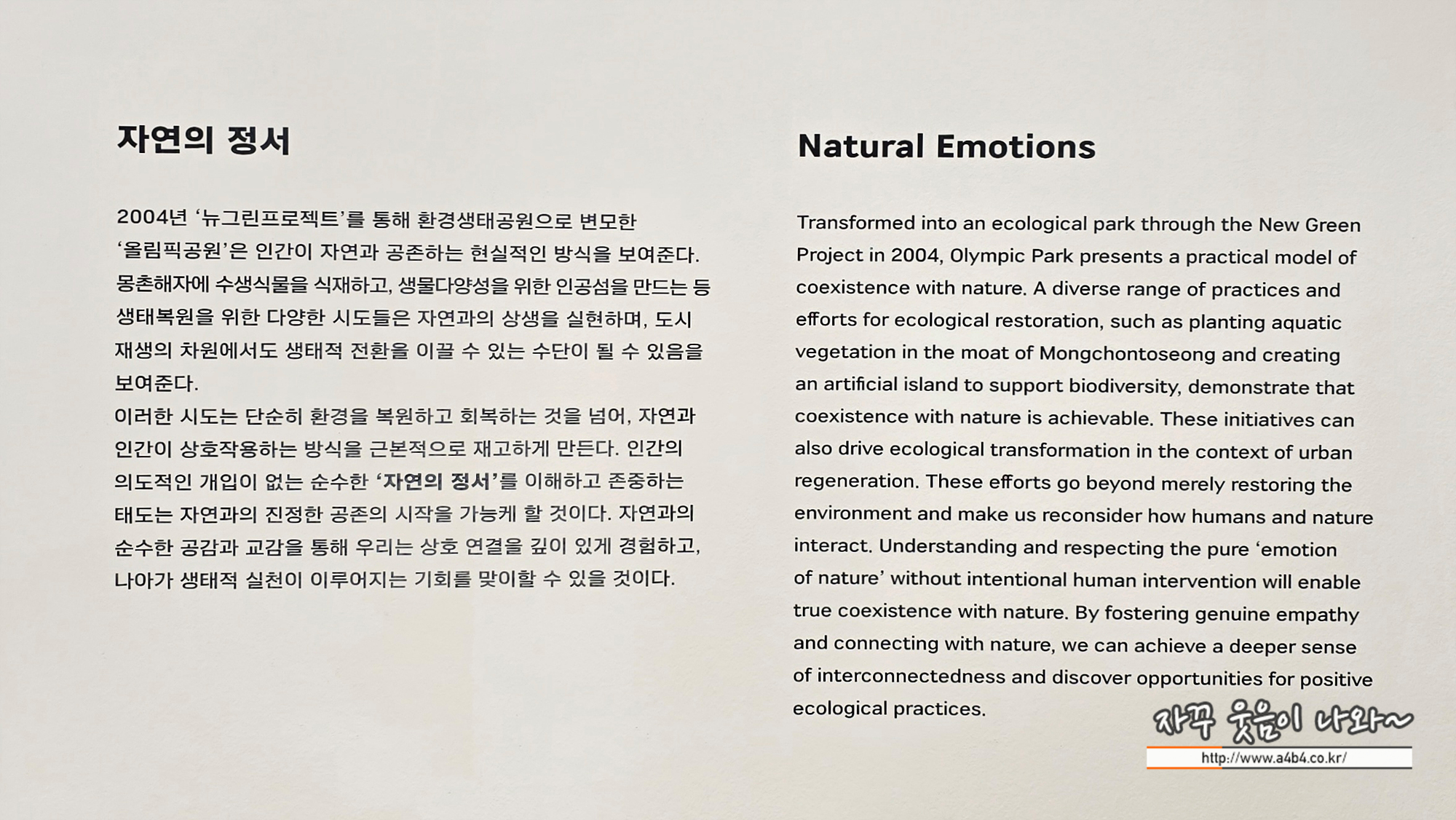 2004년 뉴그린프로젝트'를 통해 환경생태공원으로 변모한 올림픽공원'은 인간이 자연과 공존하는 현실적인 방식을 보여준다. 몽촌해자에 수생식물을 식재하고, 생물다양성을 위한 인공섬을 만드는 등 생태복원을 위한 다양한 시도들은 자연과의 상생을 실현하며, 도시 재생의 차원에서도 생태적 전환을 이플 수 있는 수단이 될 수 있음을 보여준다.