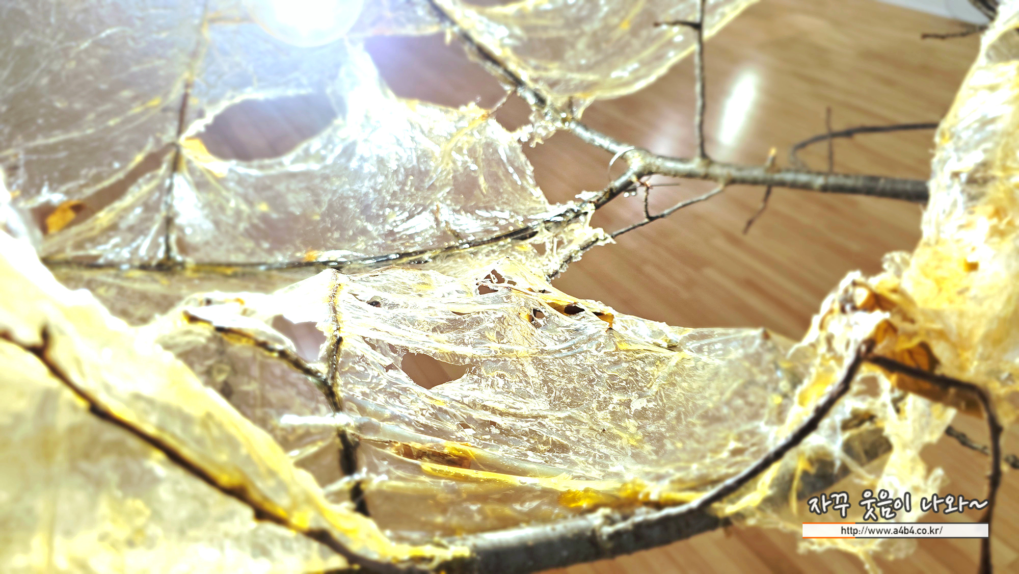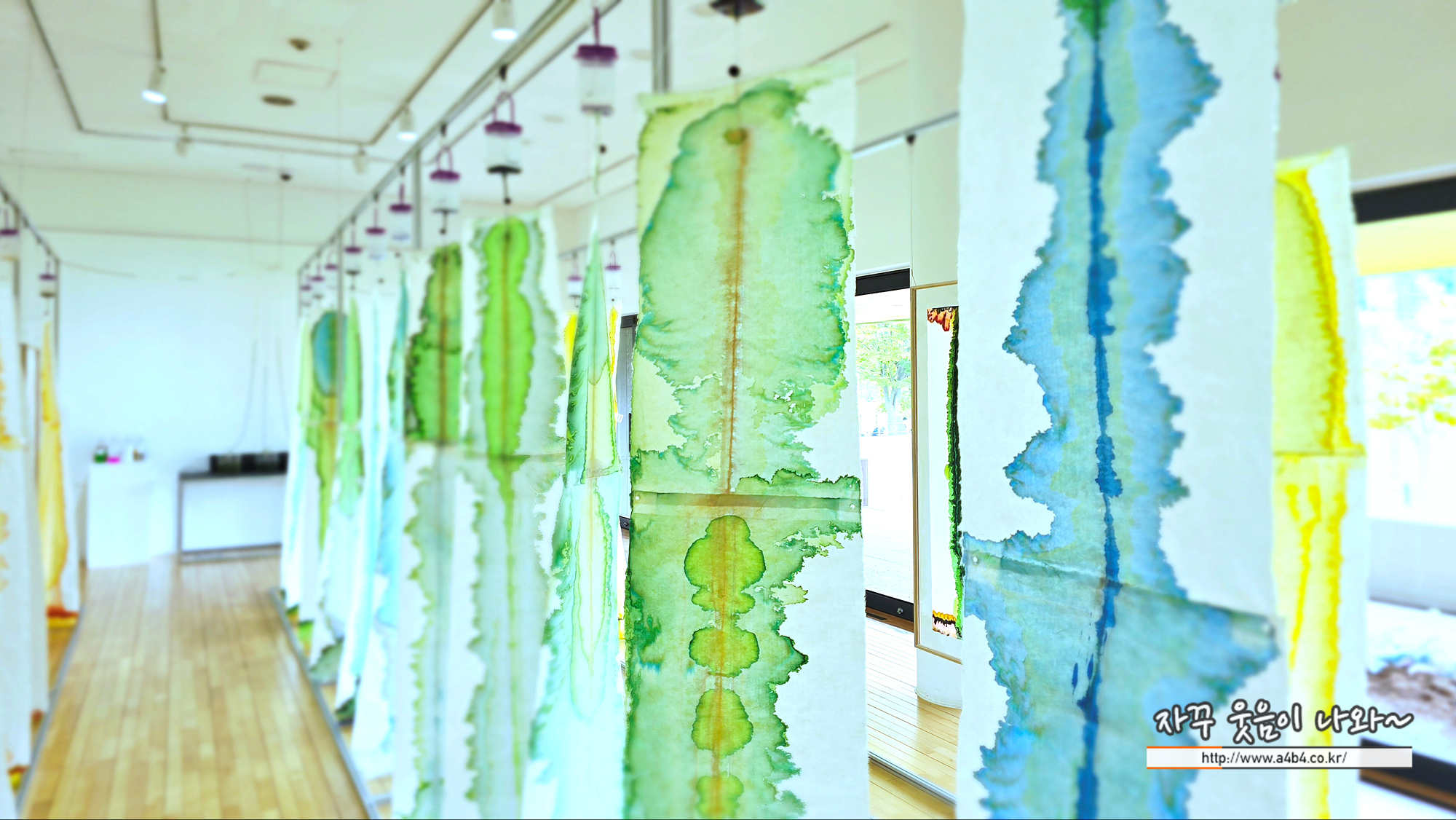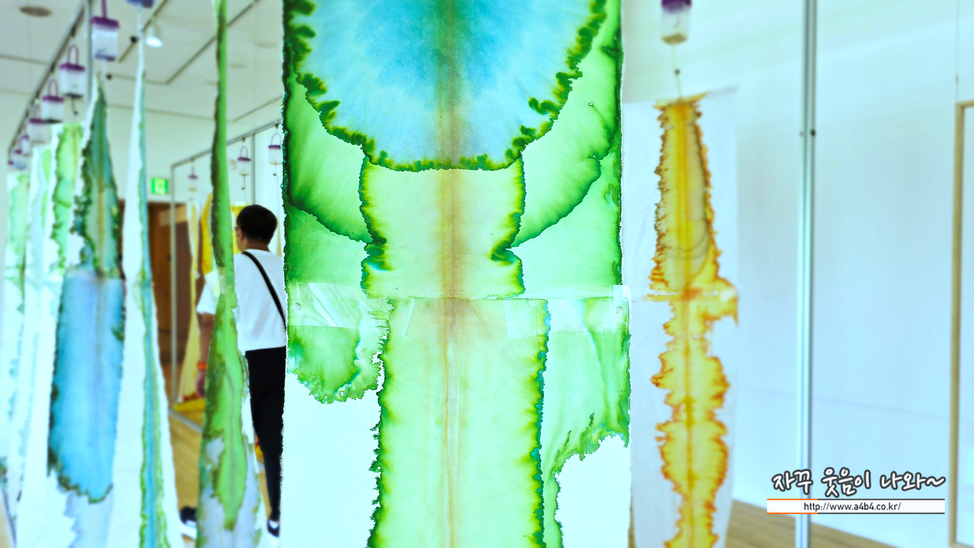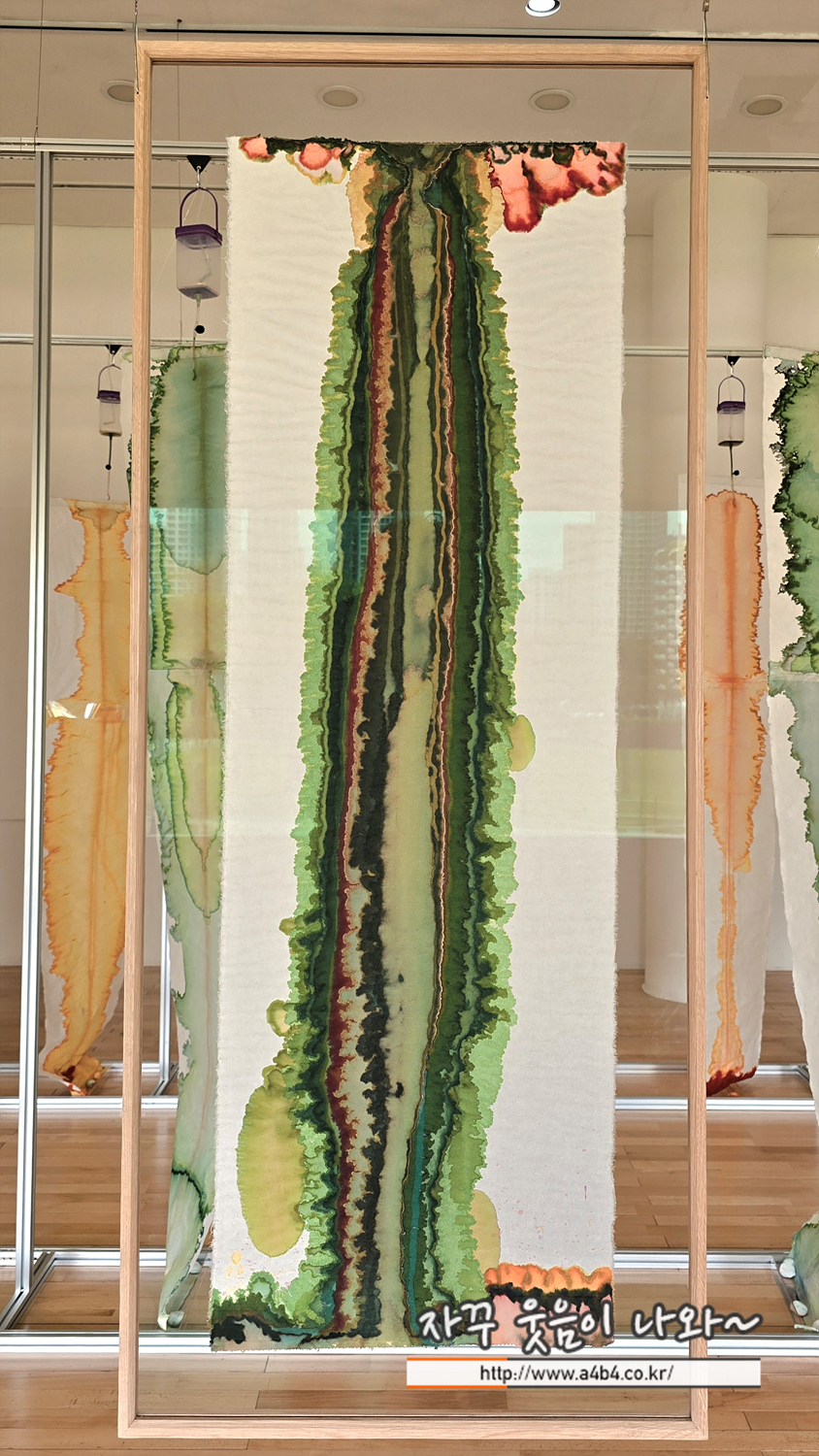 작품위를 자세히 보면 각각의 한지위에 링같이 플라스틱 통과 관이 연결되어 있습니다.
