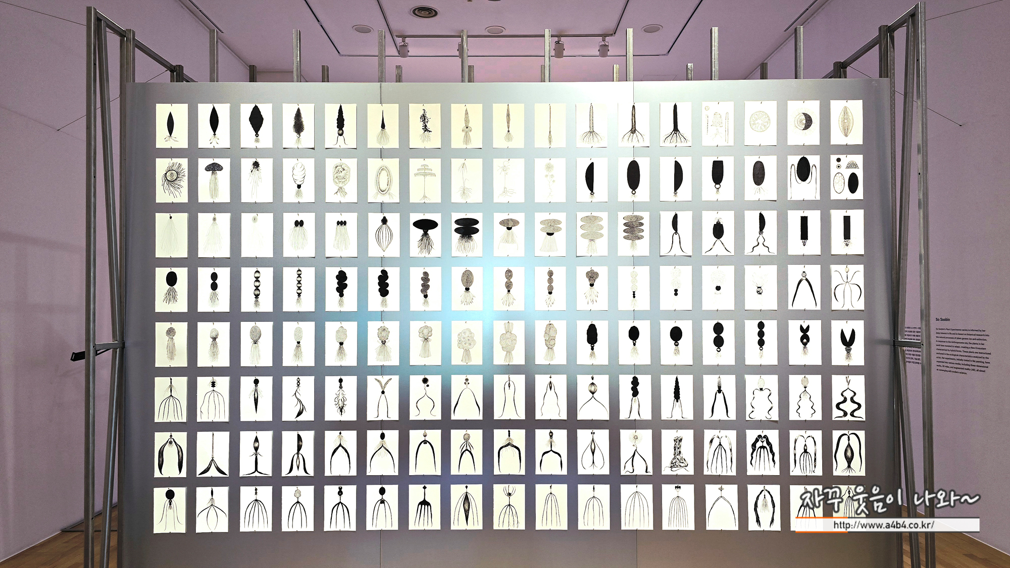 이번 소마 미술관에서 보여 드릴 소수빈 작가의 신작은 회화 작품이라고 하는데요. 미술관 주변의 자연환경들을 관찰하고 그 식물의 다양한 기관들은 하나의 종이에 합쳐서 새로운 플랜트를 만들었습니다.