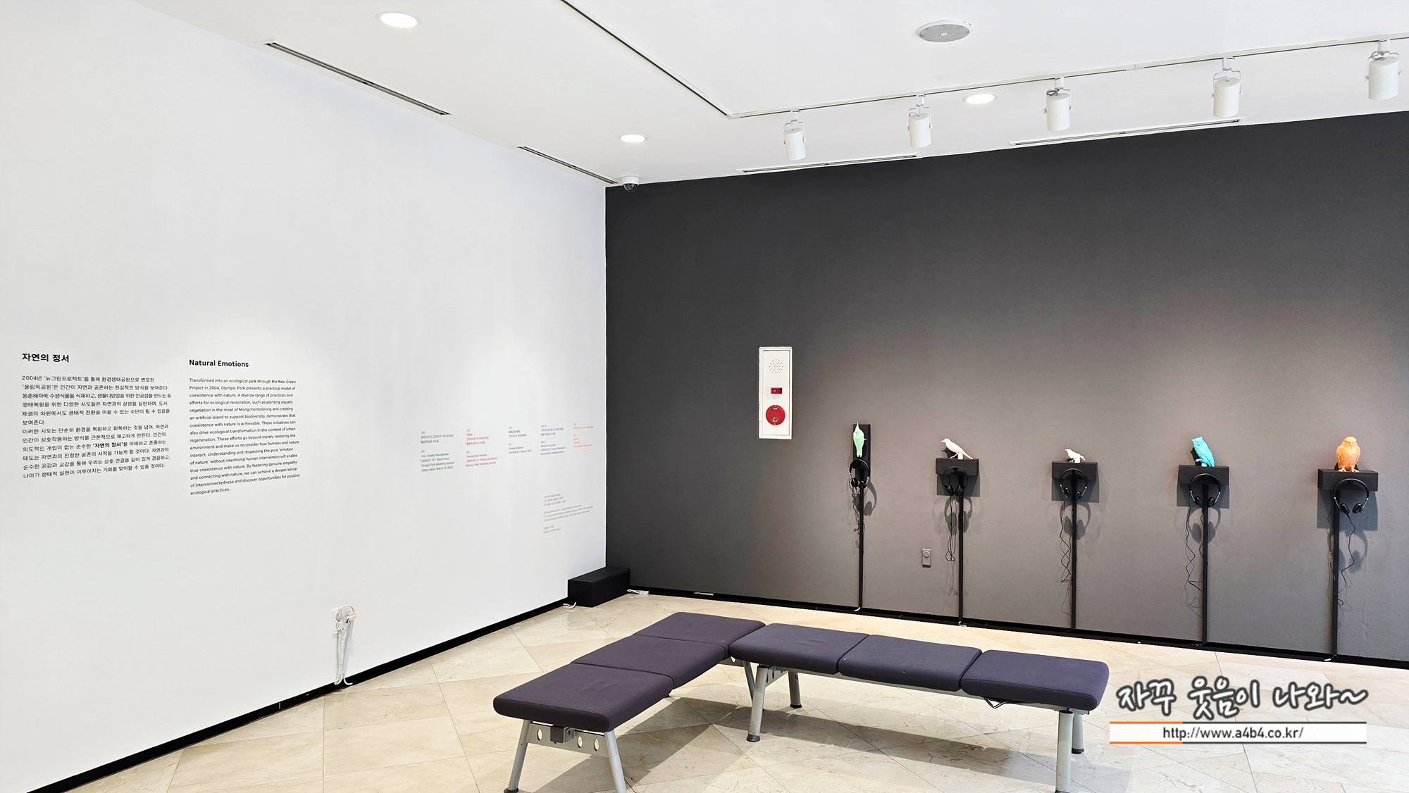 해당 공간에는 다섯 마리 조류의 모형이 있고 헤드폰을 통해 울음 소리를 들어볼 수 있다.