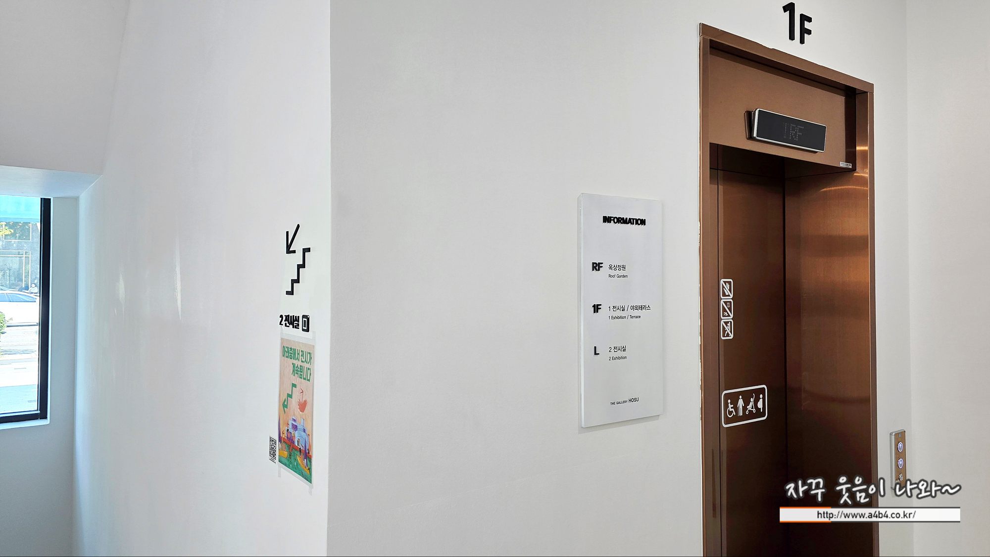 계단 또는 엘리베이터를 이용해서 더 갤러리 호수 아래층에 있는 제2전시실로 이동합니다.